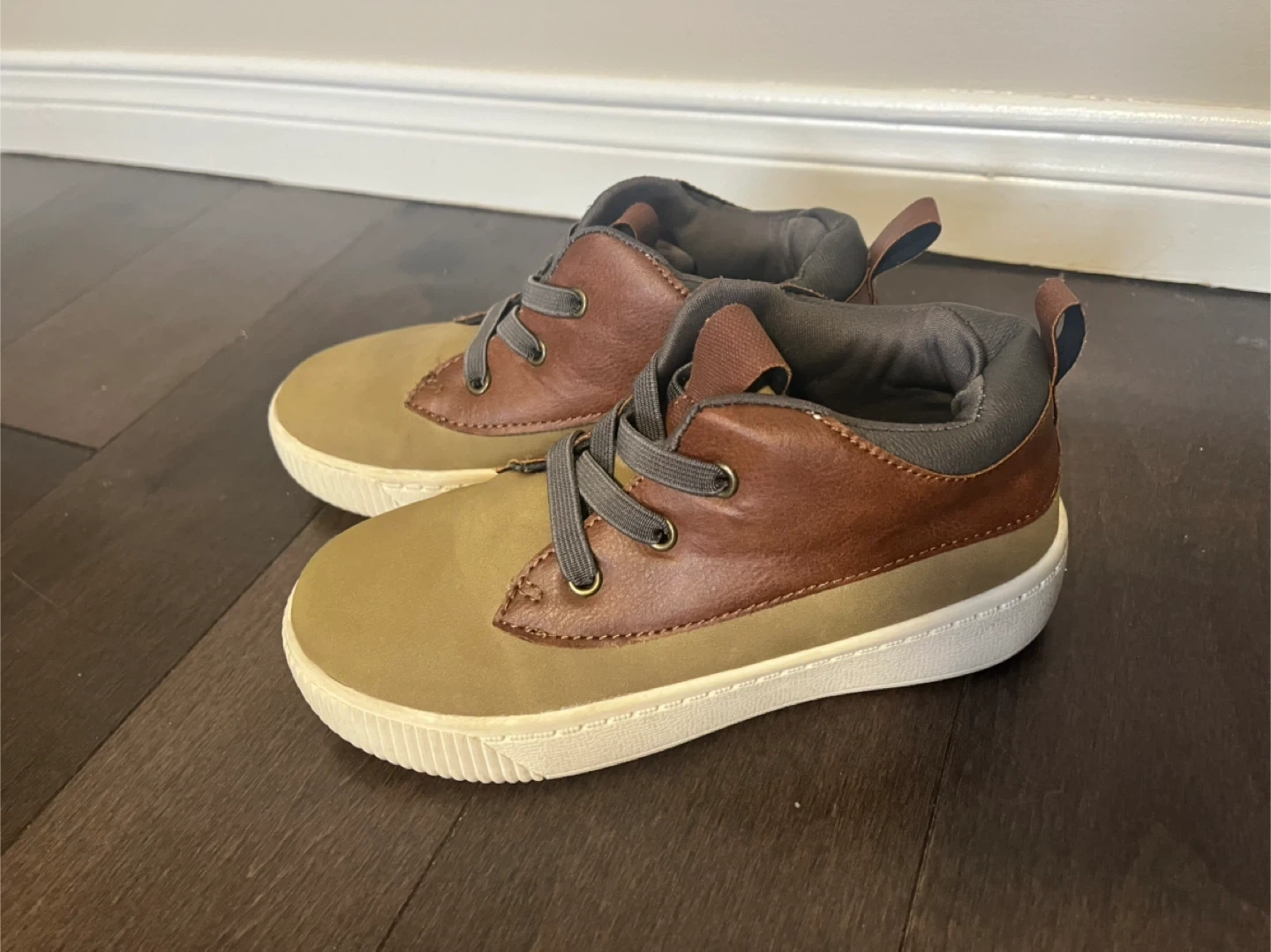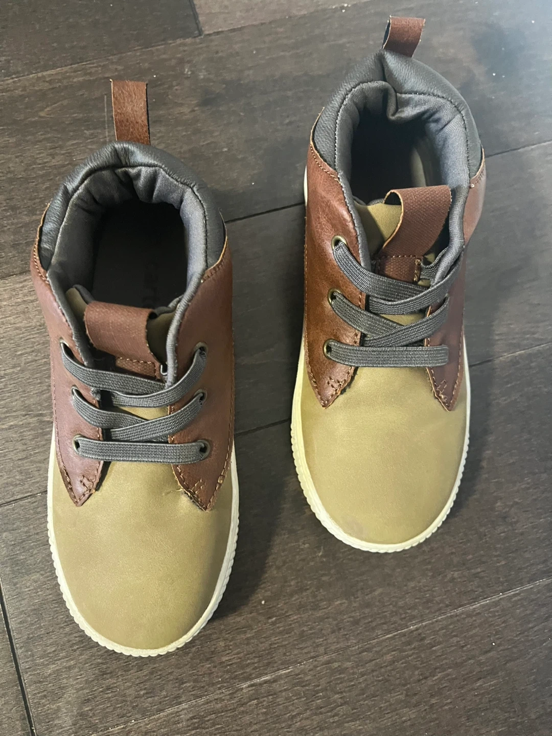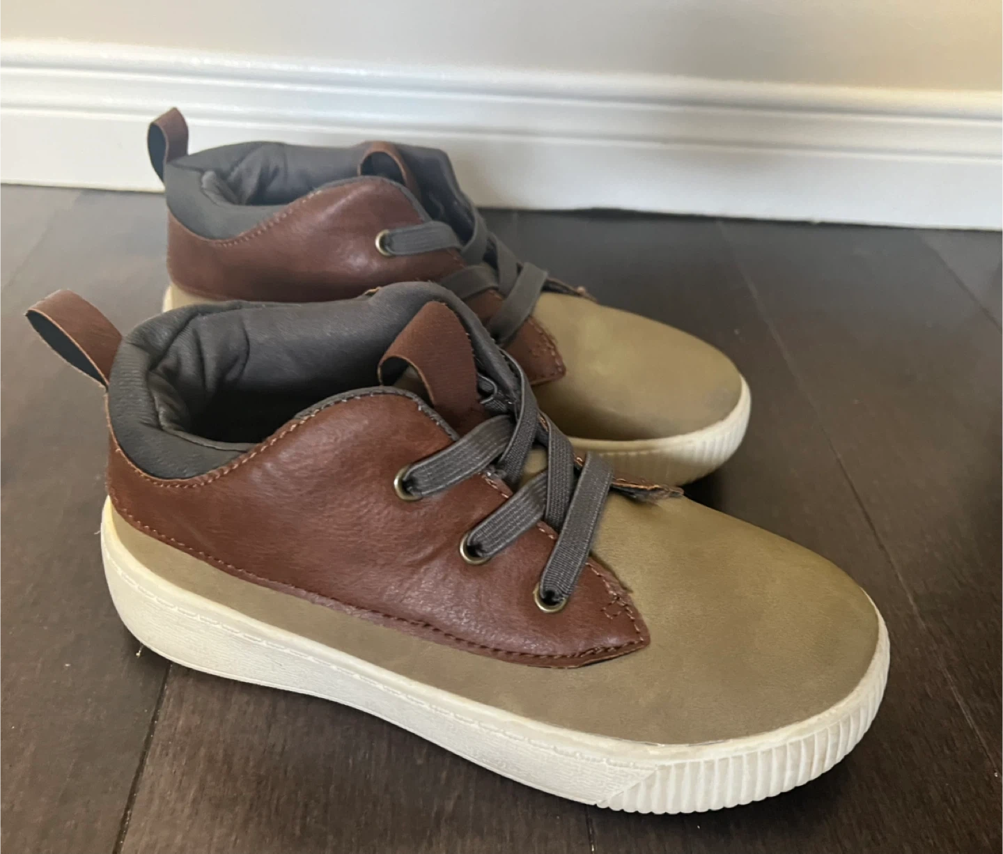 These toddler sneakers are in great condition and ready for a new adventure! They feature a stylish mix of brown and olive colours, perfect for any outfit. The laces are grey and the sole is white. Size 13M
