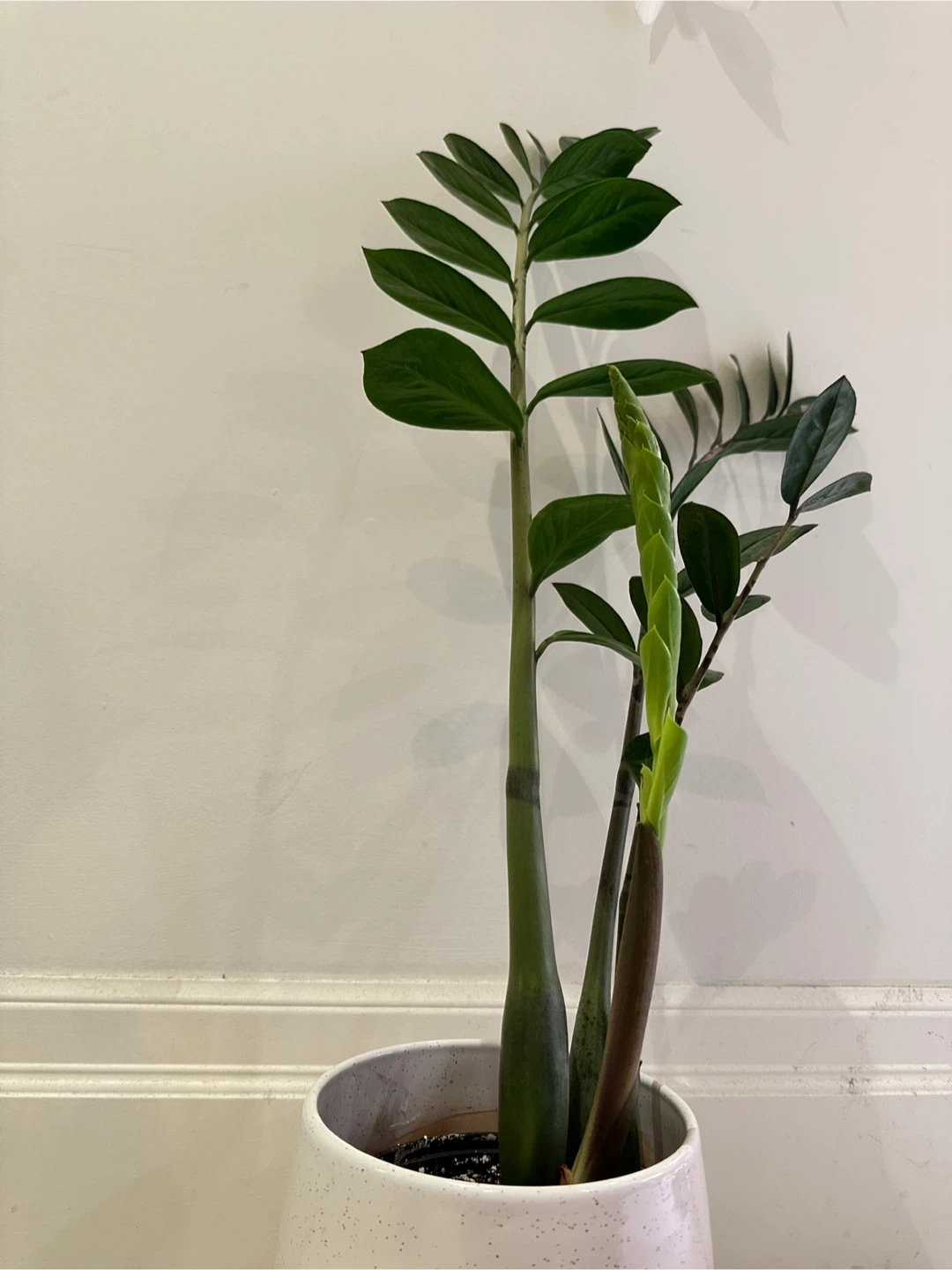 Beautiful and low maintenance plant, with 4 stems, around 2 ft tall overall. 4th stem leaves are slowly unfurling. Comes in a 6" nursery pot, ceramic planter not included.