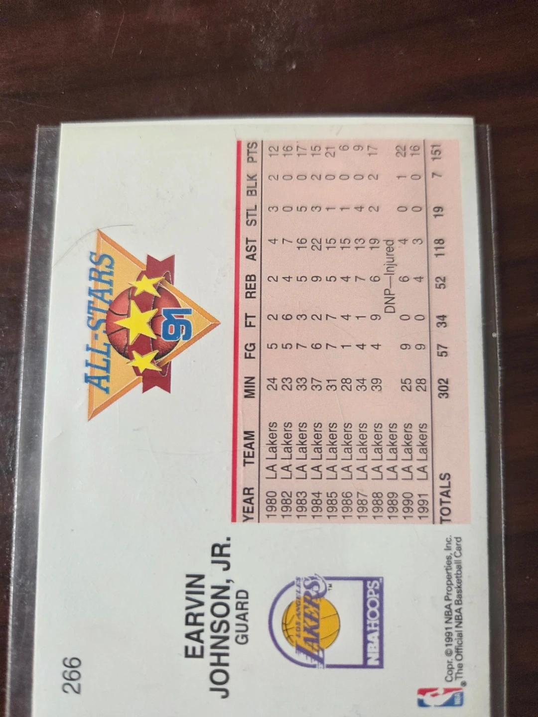 Selling a 1991 NBA Hoops trading card featuring Magic Johnson. It's in great condition and a cool piece of basketball memorabilia. Features stats from 1980-1991 season.