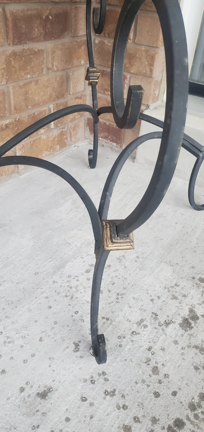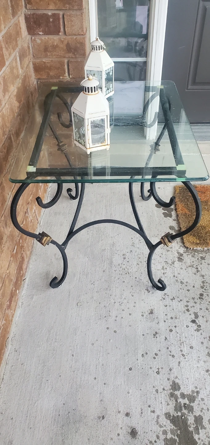 Selling a glass top end table with a decorative antique metal frame. It's perfect for adding a touch of elegance to any room. The table is in good condition and ready to be used!
