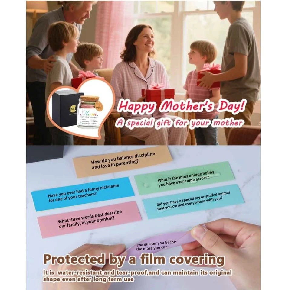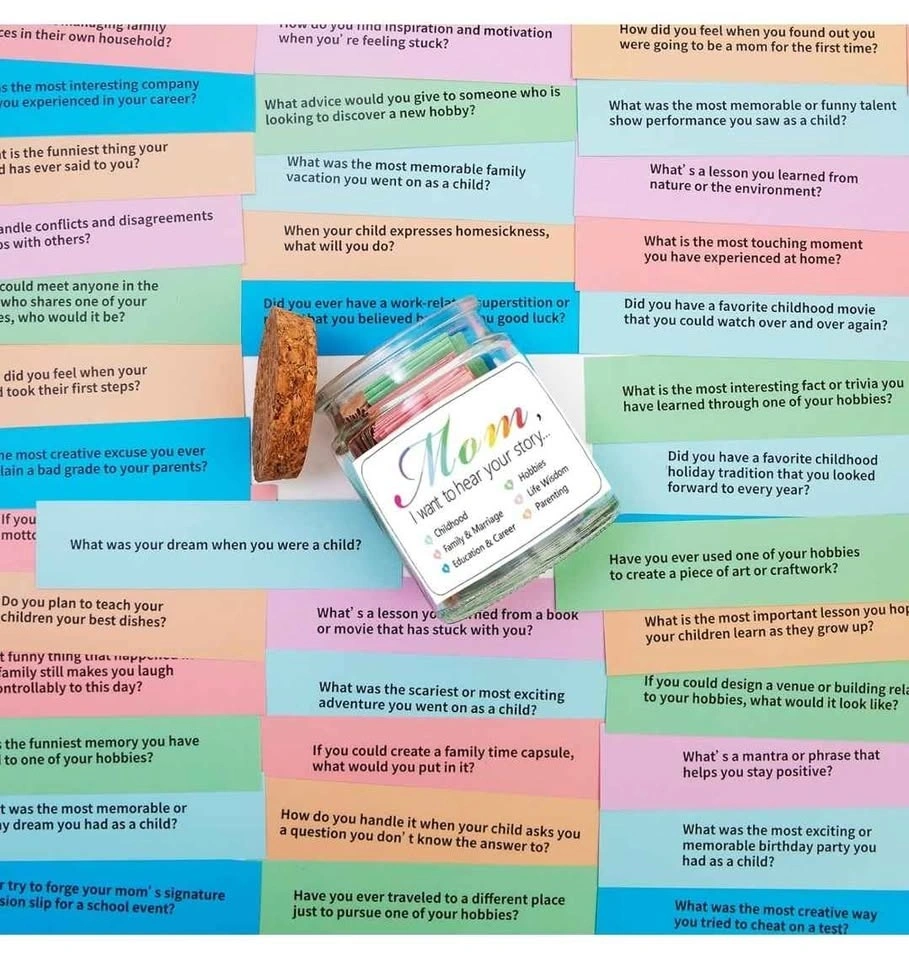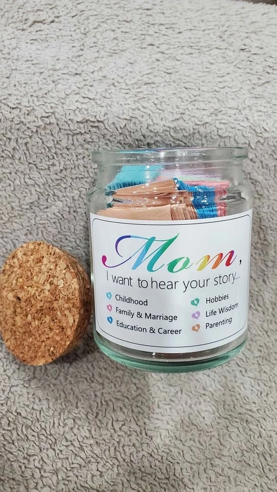 This is an interactive story-sharing game jar designed for mothers to share their life experiences with their families. Mom, I Want to Hear Your Story Jar with 90 PCS Cards, Mother's Day, Birthday Gifts from Daughter or Son, Christmas, Mother-in-Law, New Mom Gifts, Conversation Cards for Family. Hespeler Cambridge