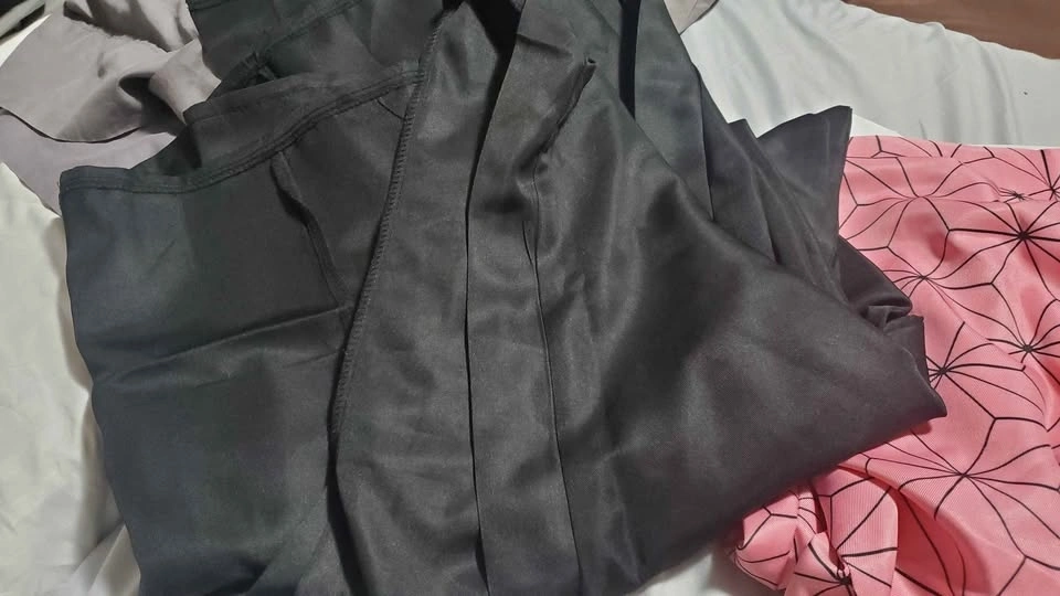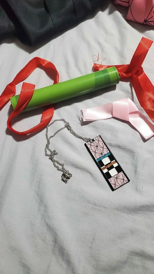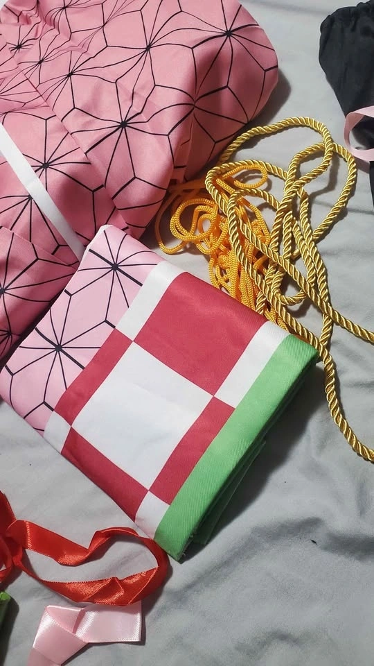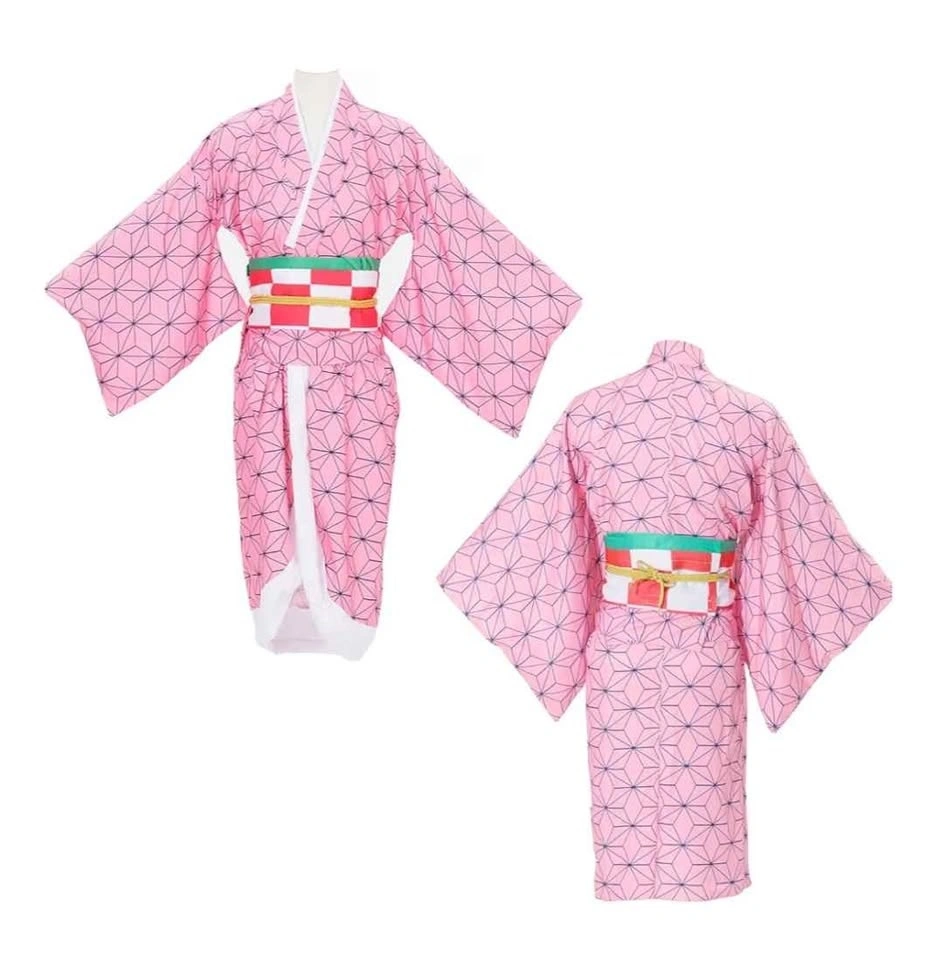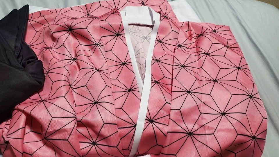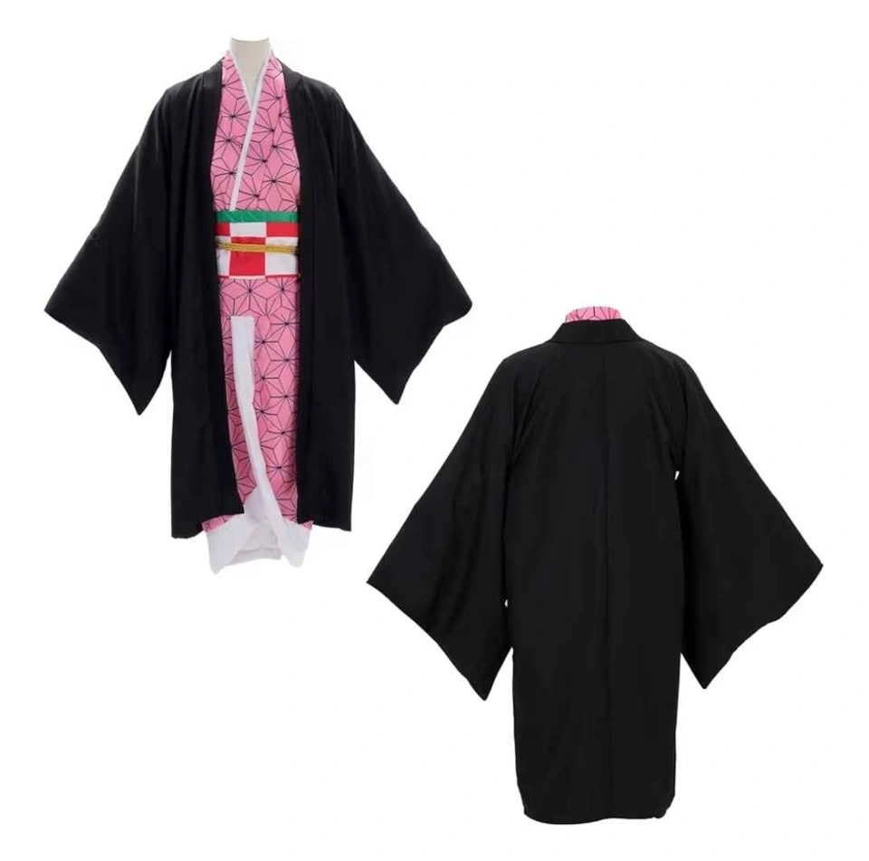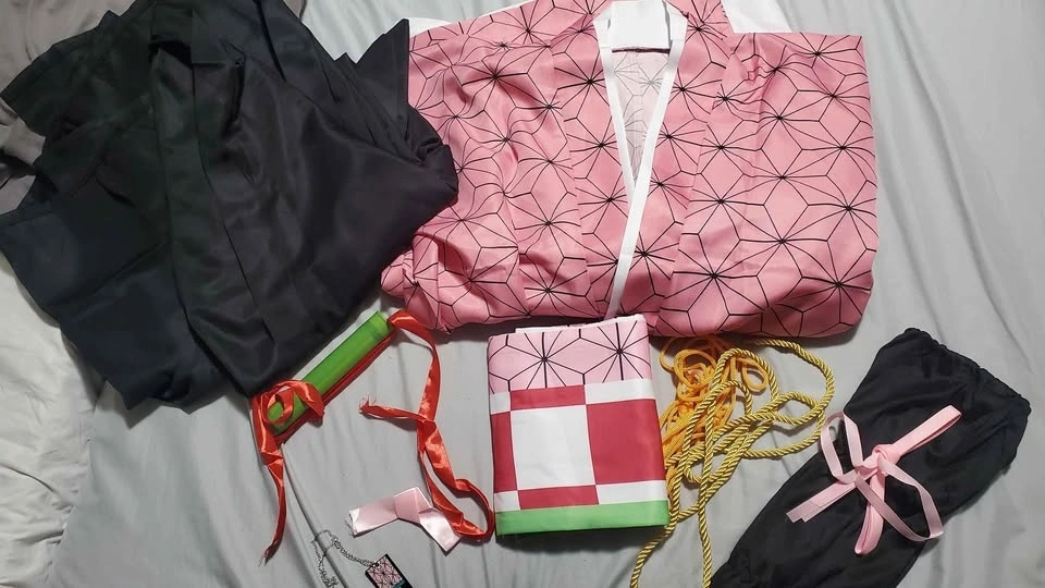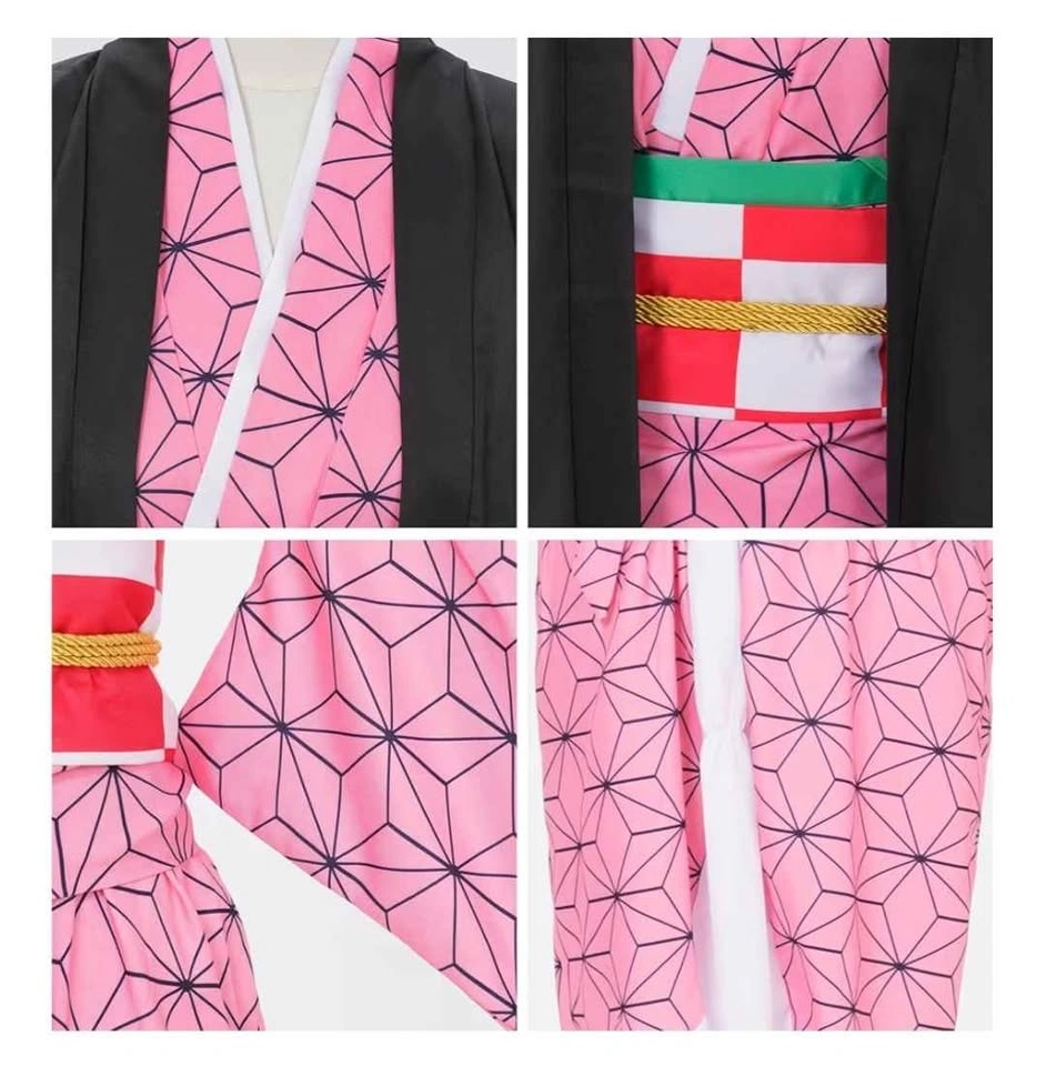 Nezuko Kamado anime cosplay kimono outfit set. Pink kimono + black kimono coat + waist seal + belt + leg sleeves + leg straps + headwear + mouthpiece+ necklace. Hespeler Cambridge