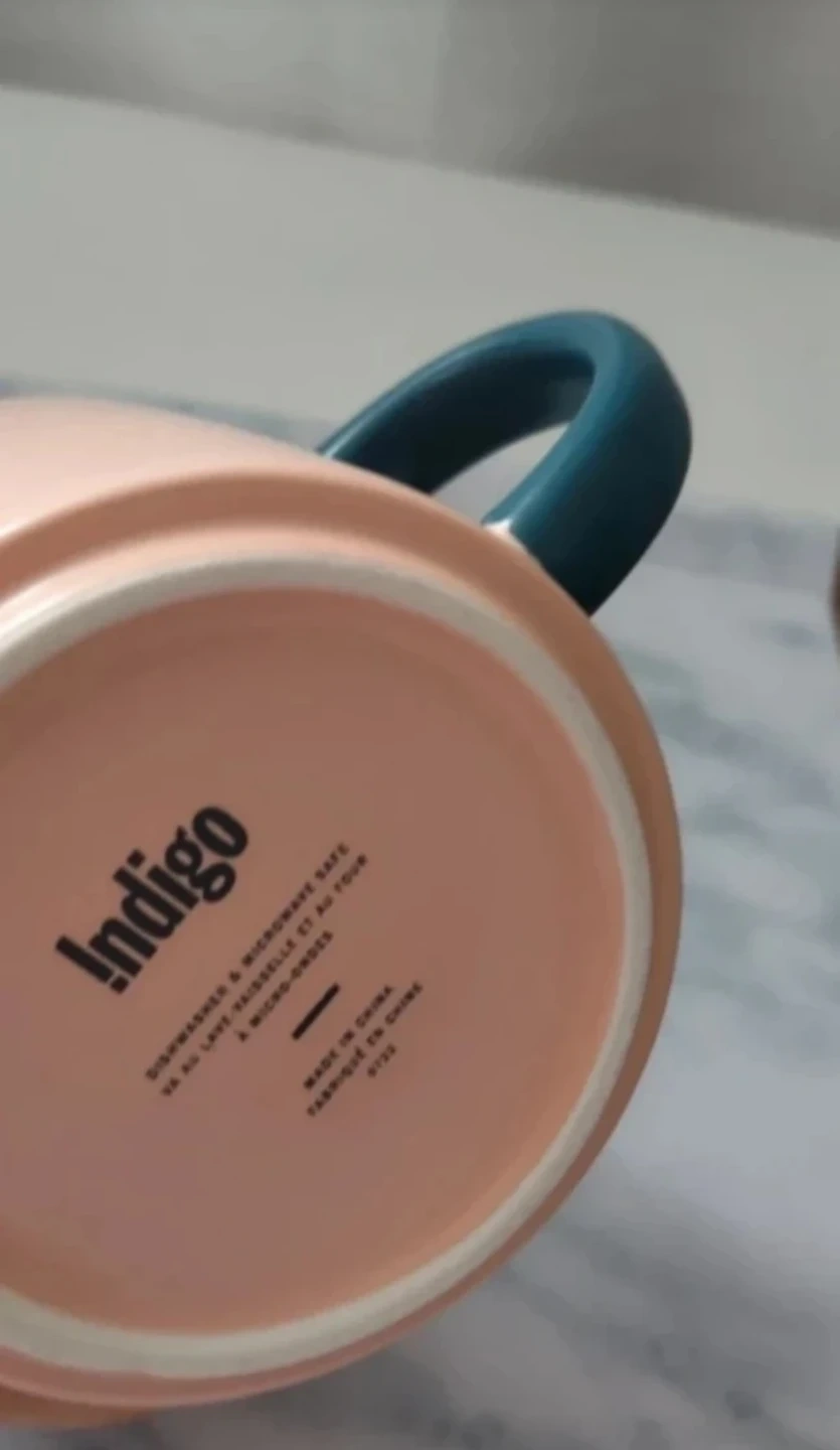 Selling a set of three Indigo mugs. One is black with a gold handle and a white 'S', another is pink with a blue handle and a black design, and the third is blue with a floral design. They are microwave safe and hand wash only.