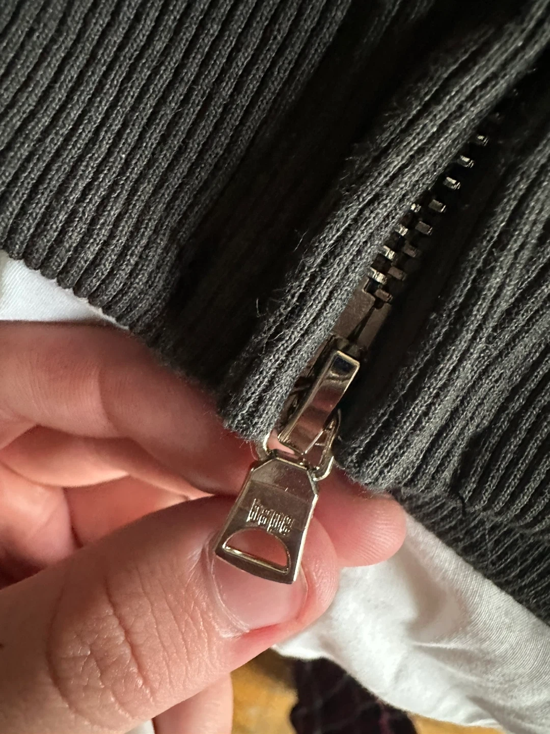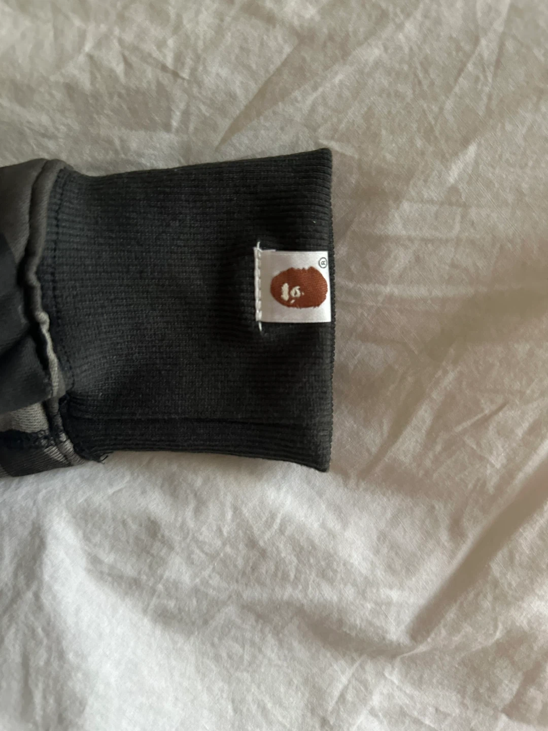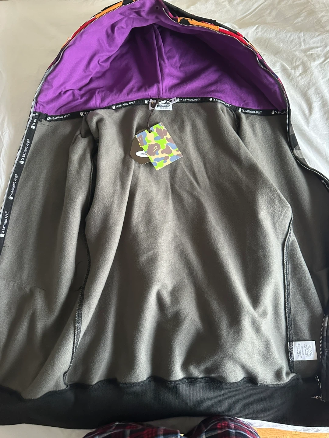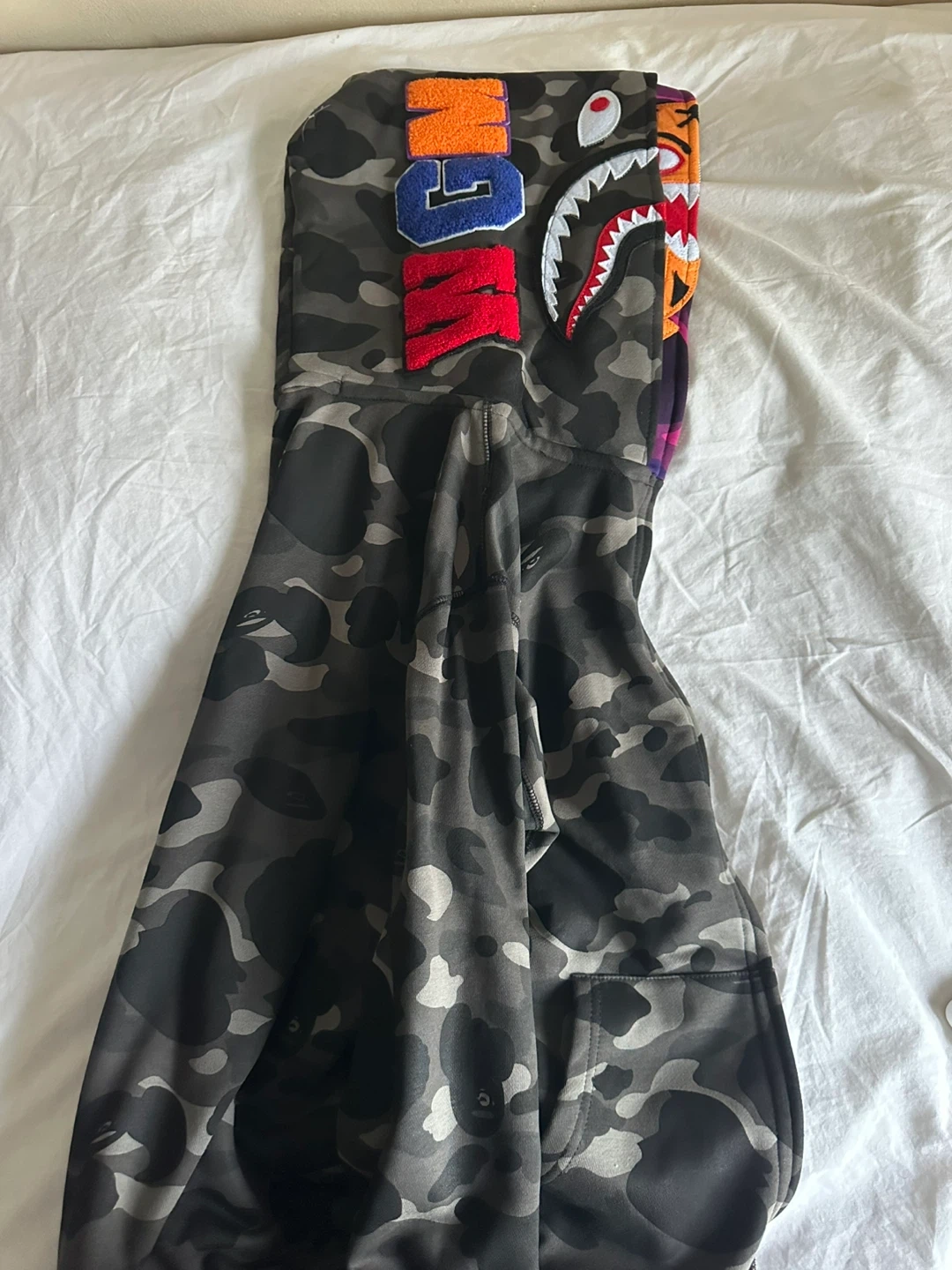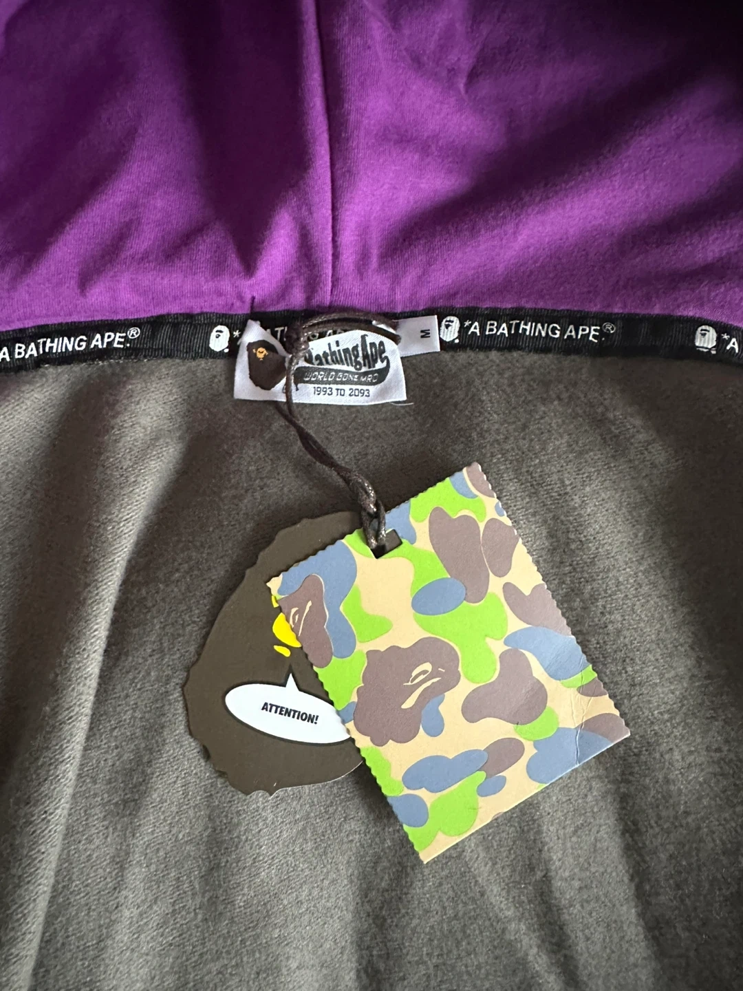 This is a brand new A Bathing Ape (BAPE) full zip hoodie. It features a camo design with a shark on the hood. The inside of the hood is purple. The size is M.