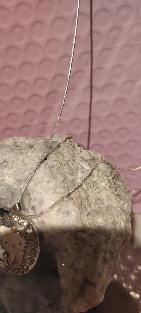 This is a cute Hello Kitty pendant necklace. It features Hello Kitty sitting on a crescent moon, surrounded by sparkly stones. The chain is 925 silver and in great condition!