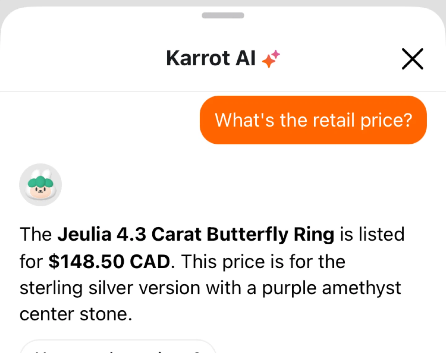 1 / 61 / 6Buy & SellNew Jeulia 4.3 Carat Butterfly Ring Size 5.5New Jeulia 4.3 Carat Butterfly Ring Size 5.5$65New in original Box Stamped S925 Size 5.5ConditionNewSize5.5BrandJeulia WHERE TO MEETCheck LocationView MapSELLERverifiedShirinBrock Ridge25116 reviews0 chats·3 favorites·73 viewsSEND CHAT TO SELLERHi Shirin! I’m interested in your listing.Hi Shirin! I’m interested in your listing.Get the Karrot app to chatSign In to chat