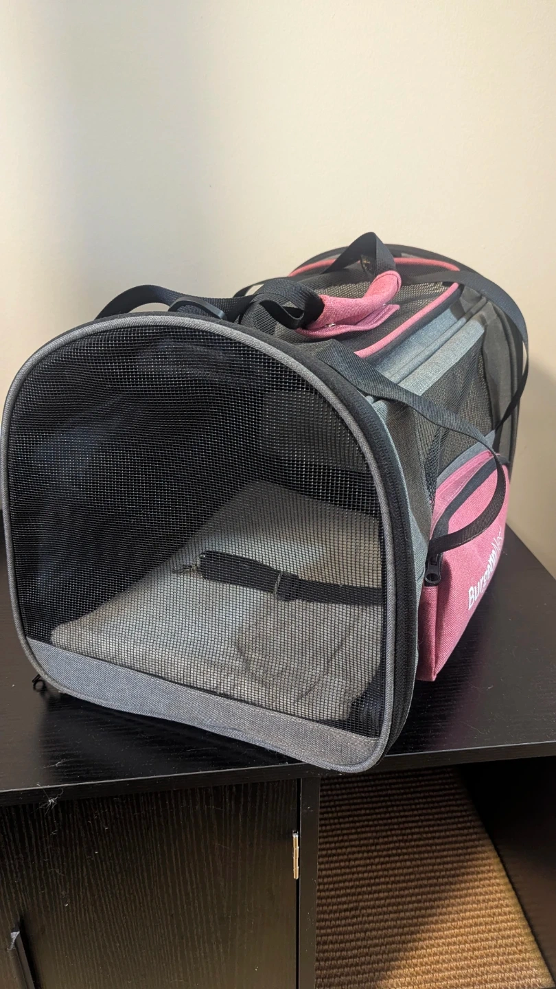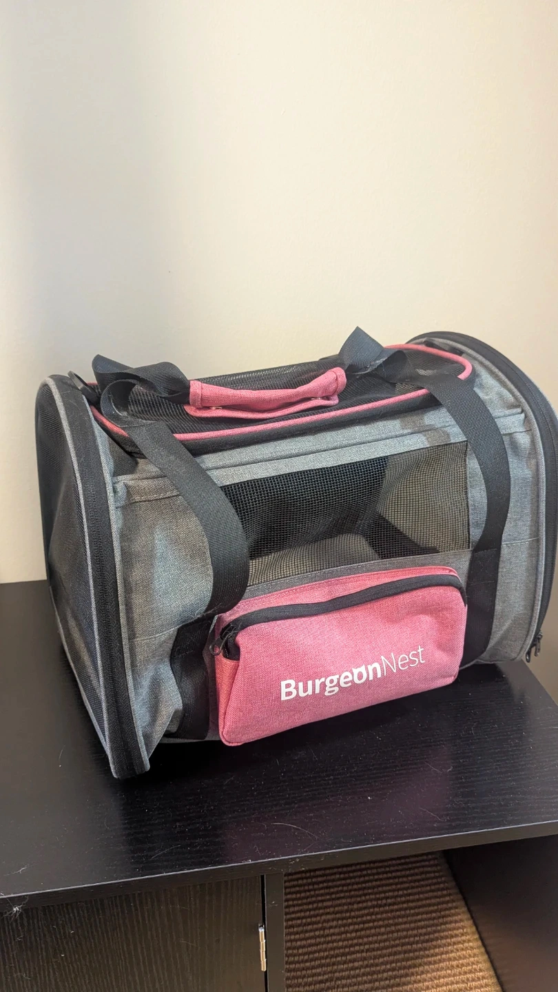 BurgeonNest pet carrier! It's in great shape and perfect for taking your furry friend on the go. The carrier is grey and pink, and features mesh windows for ventilation and visibility. It also has a convenient carrying handle and a removable, washable pad for easy cleaning