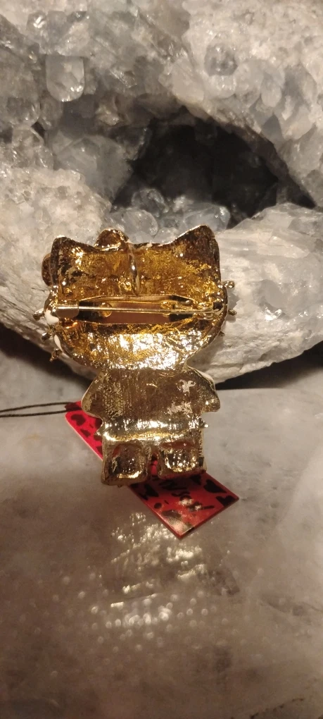 This is a Betsey Johnson Hello Kitty brooch. It has a gold tone and is in good condition. Perfect for adding a touch of whimsy to any outfit