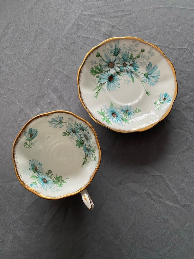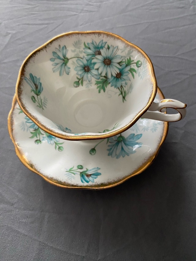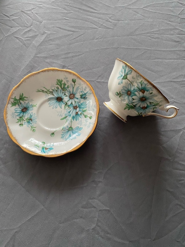 This is a Royal Albert Bone China teacup and saucer set in the Marguerite pattern, featuring a delicate design of blue flowers and gold trim, perfect for collectors or anyone who enjoys fine tea. It is in excellent condition. Additional details: * Brand: Royal Albert * Pattern: Marguerite * Material: Bone China * Made in England