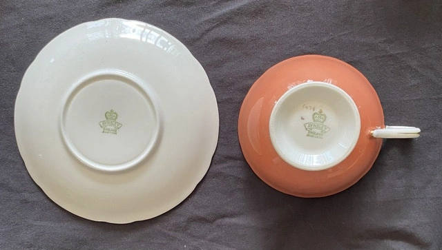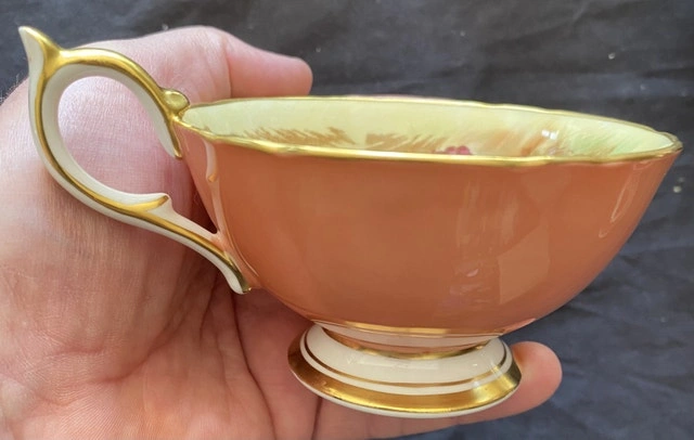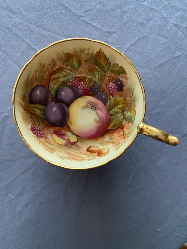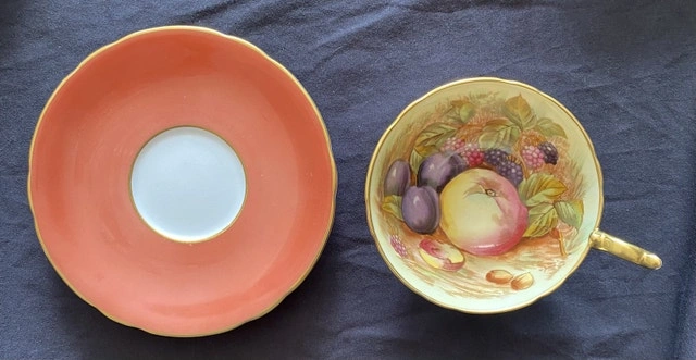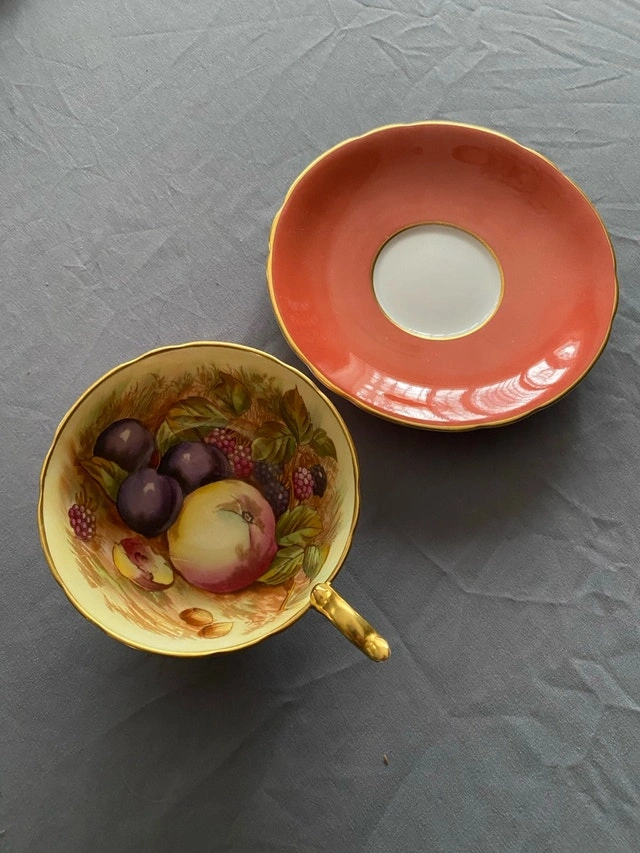 Indulge in the charm of yesteryear with this beautiful, used Aynsley teacup and saucer set, showcasing a delightful fruit pattern. The fine bone china exudes elegance, perfect for collectors or anyone who appreciates a touch of vintage sophistication. This teacup and saucer are in excellent condition, ready to be cherished once more. Here are some details: * Brand: Aynsley * Pattern: Fruit * Material: Bone China * Origin: England