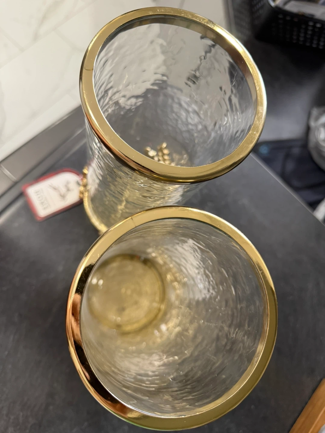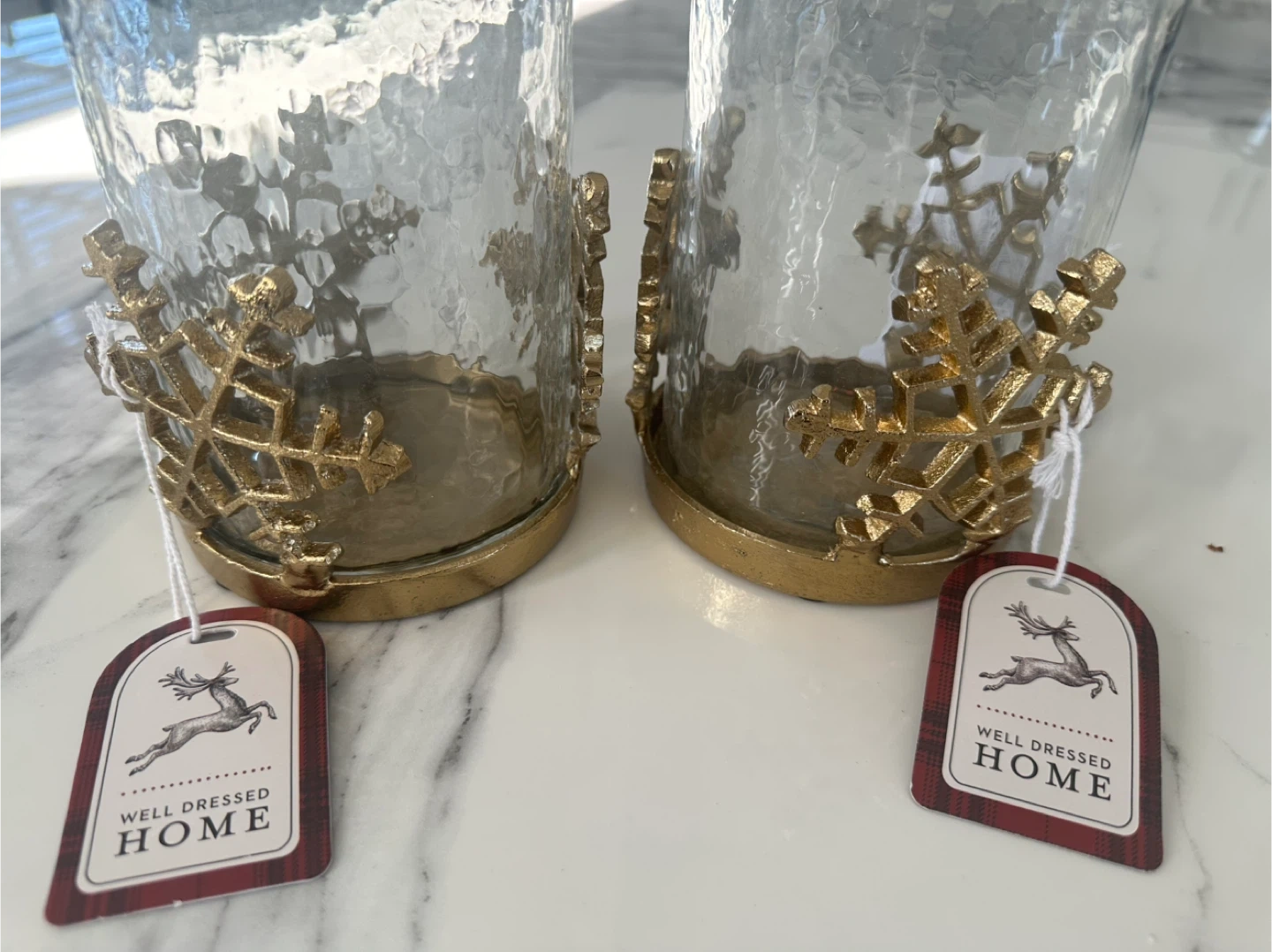 A pair of beautiful glass hurricane lamps or tabletop decor. Brand new, tags still attached. Perfect idea for Christmas gifting too!