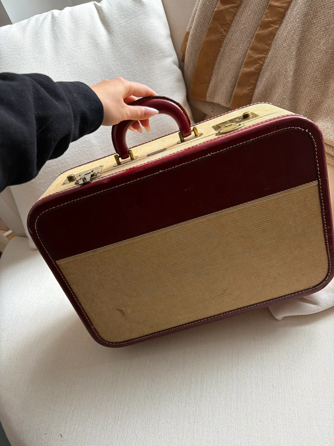 Giving away a vintage vanity case! It features a tan canvas body with burgundy leather trim. It's in good condition, perfect for storing cosmetics or using as a unique travel accessory