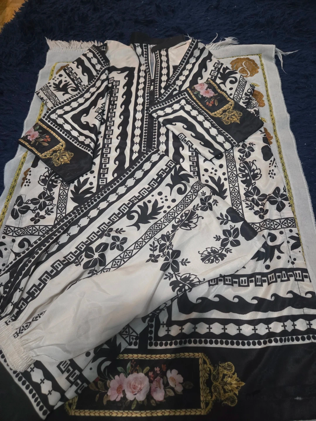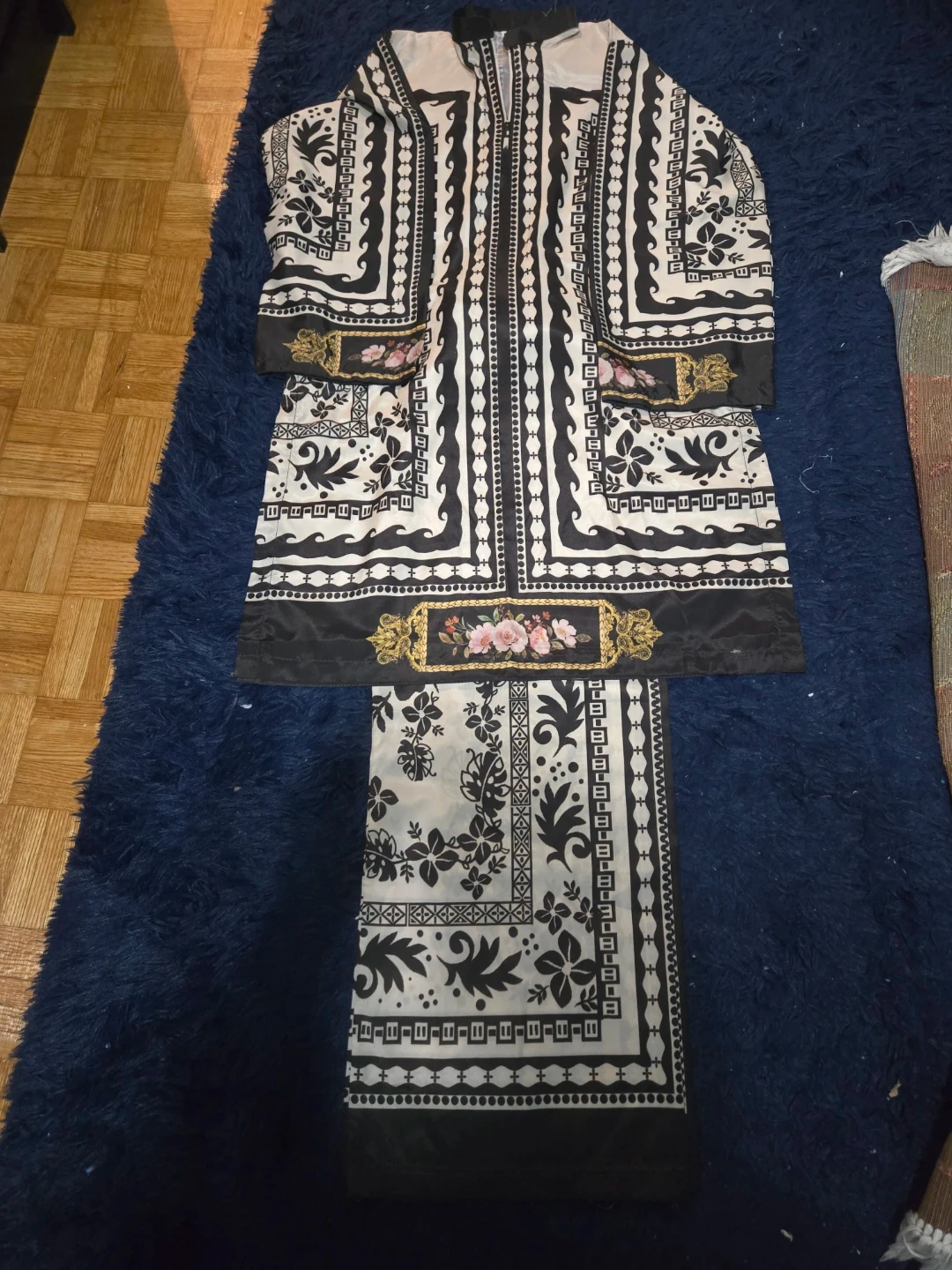 Selling a beautiful salwar kameez in a striking black and white floral pattern. This outfit is perfect for a special occasion or everyday wear. The intricate design and comfortable fabric make it a stylish and practical choice. It's in great condition and ready for a new home!