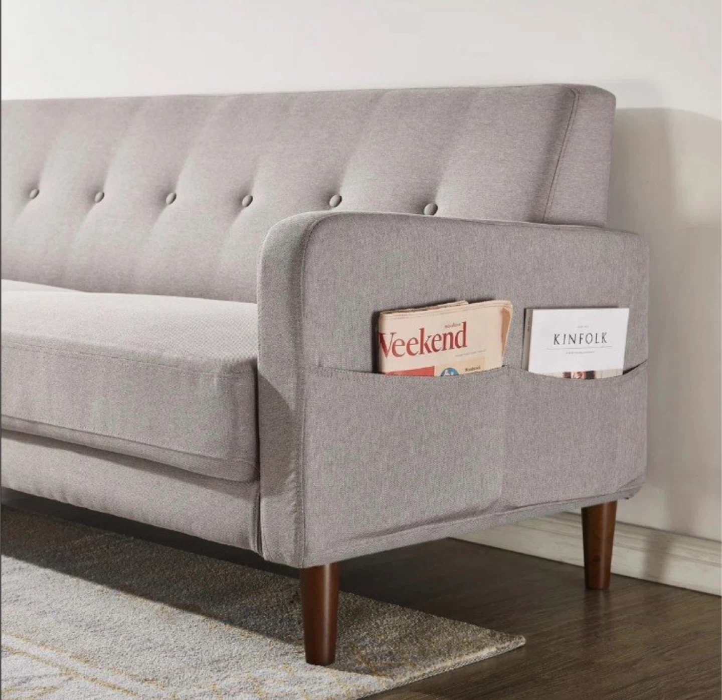 *Mellow Adair Sofa in light grey! It's 73 inches wide, 30 inches tall, and 29 inches deep. This sofa has handy side pockets for magazines or books. The sofa comes in its original box!