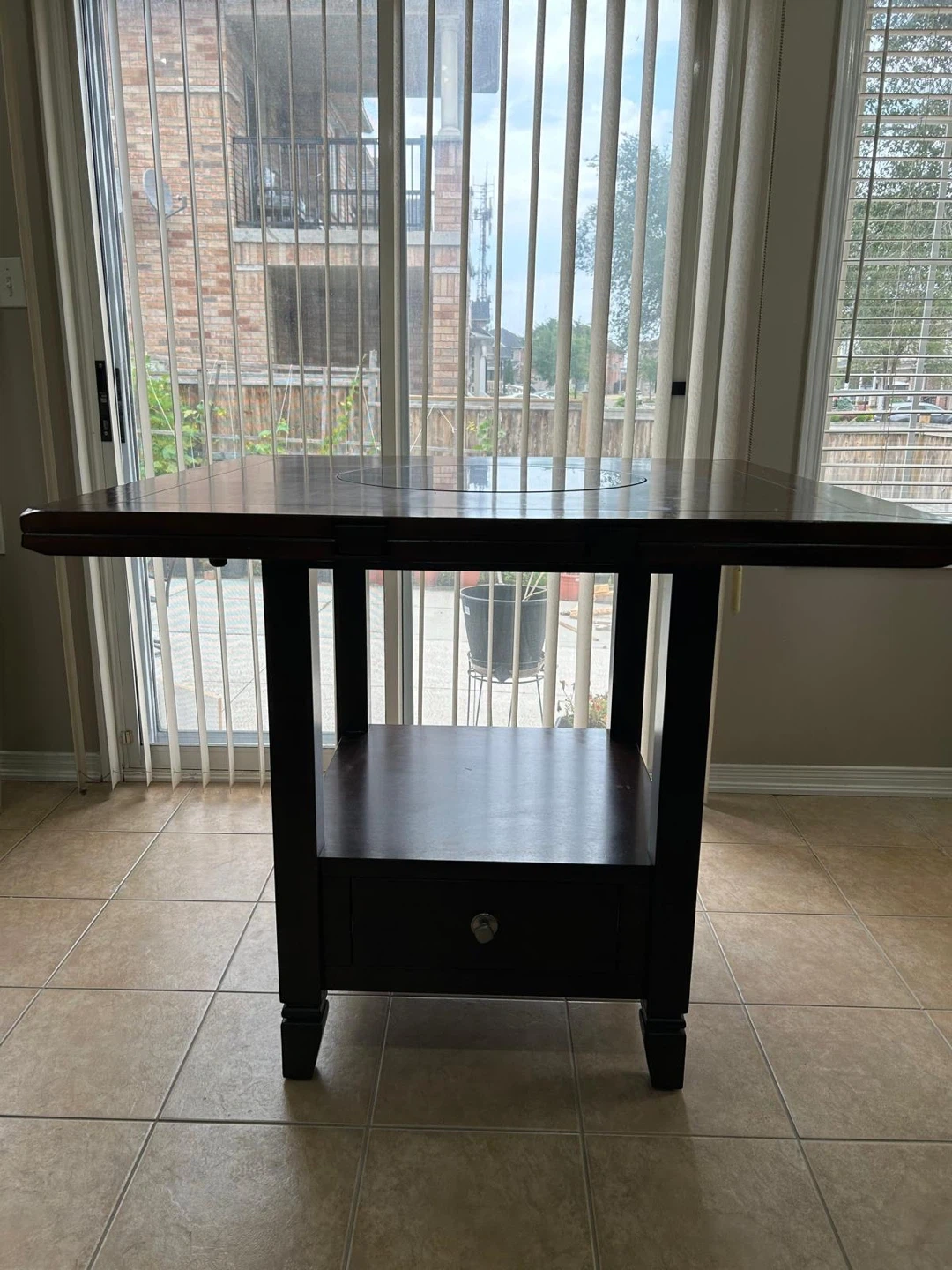 Selling a dark wood dining table set. The table is approximately 41 inches wide. Perfect for a smaller dining space!