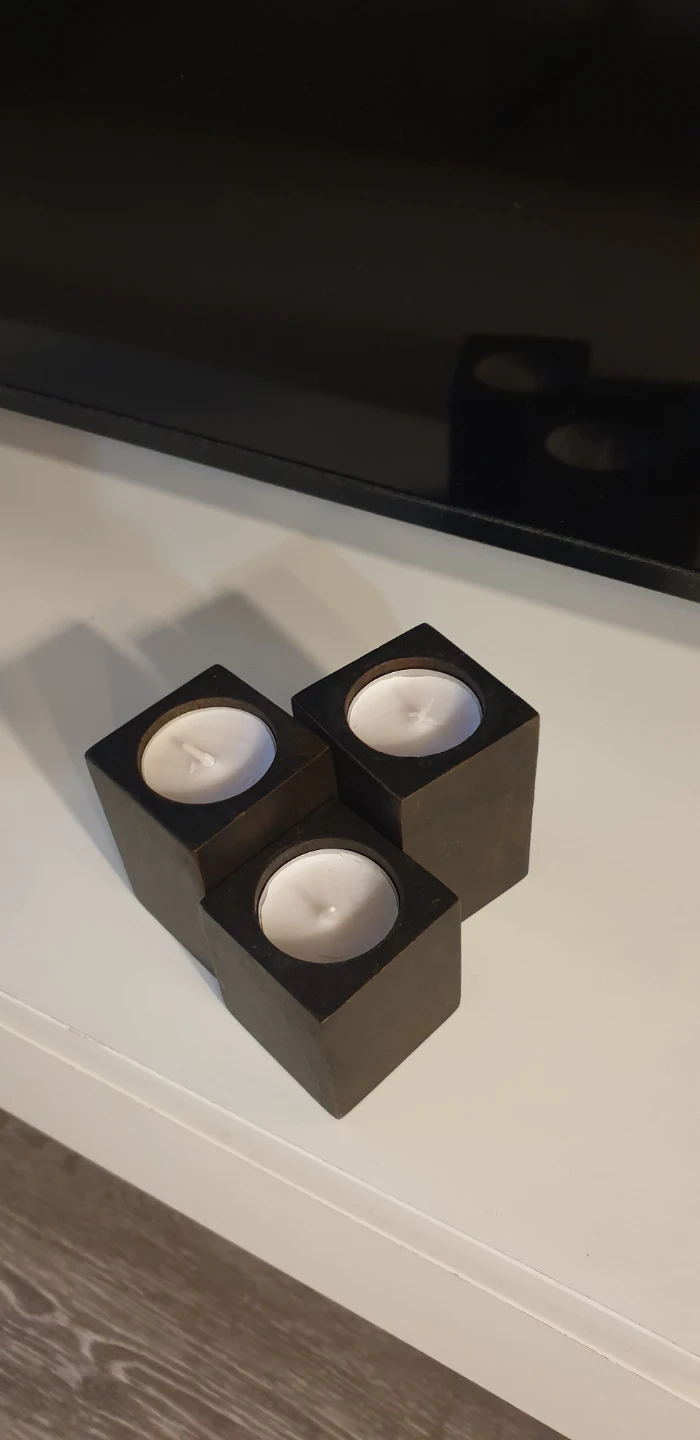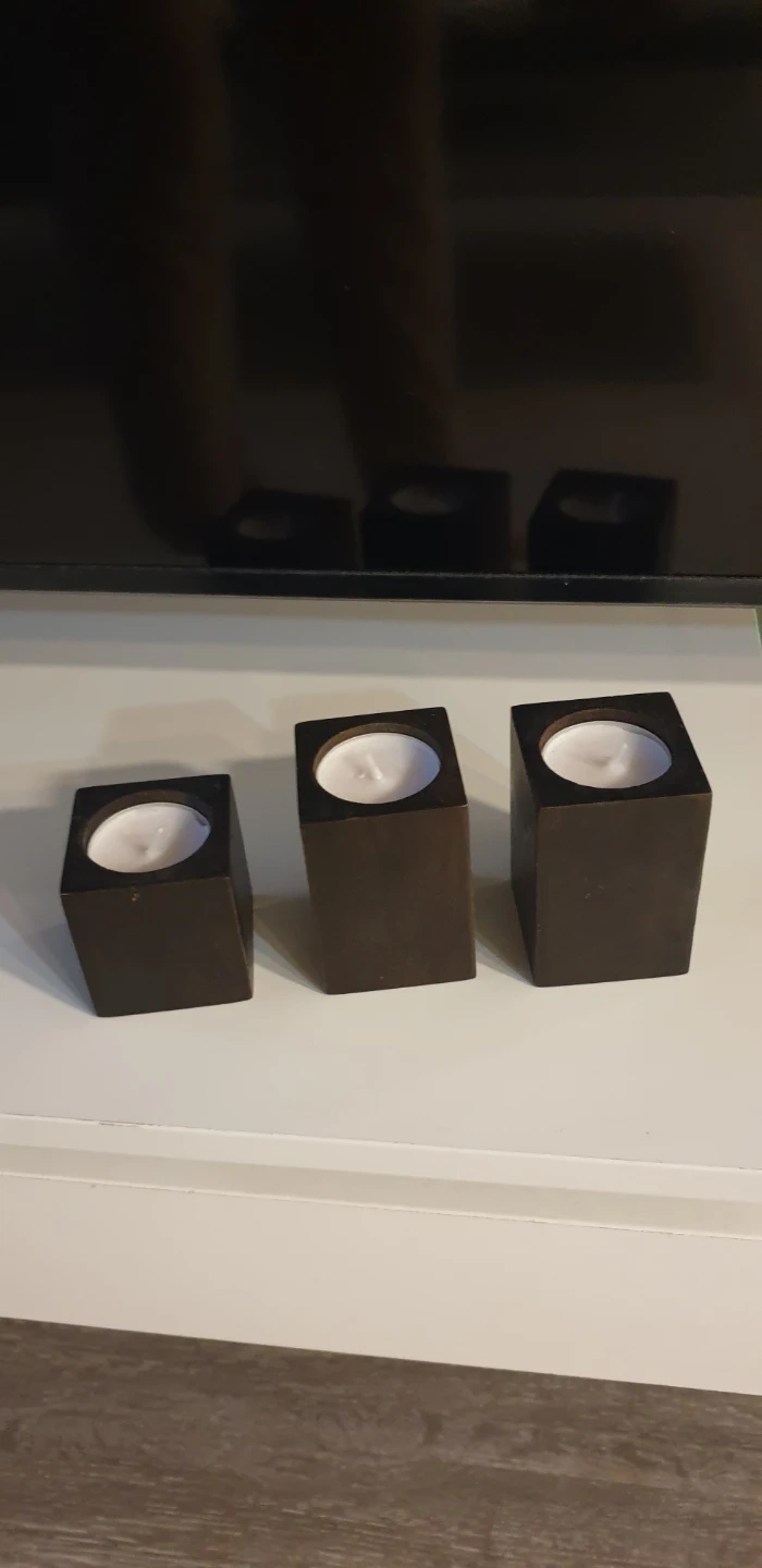 Here's a set of three wooden candle holders! They're in great shape and would look lovely in any room. Perfect for creating a cozy atmosphere