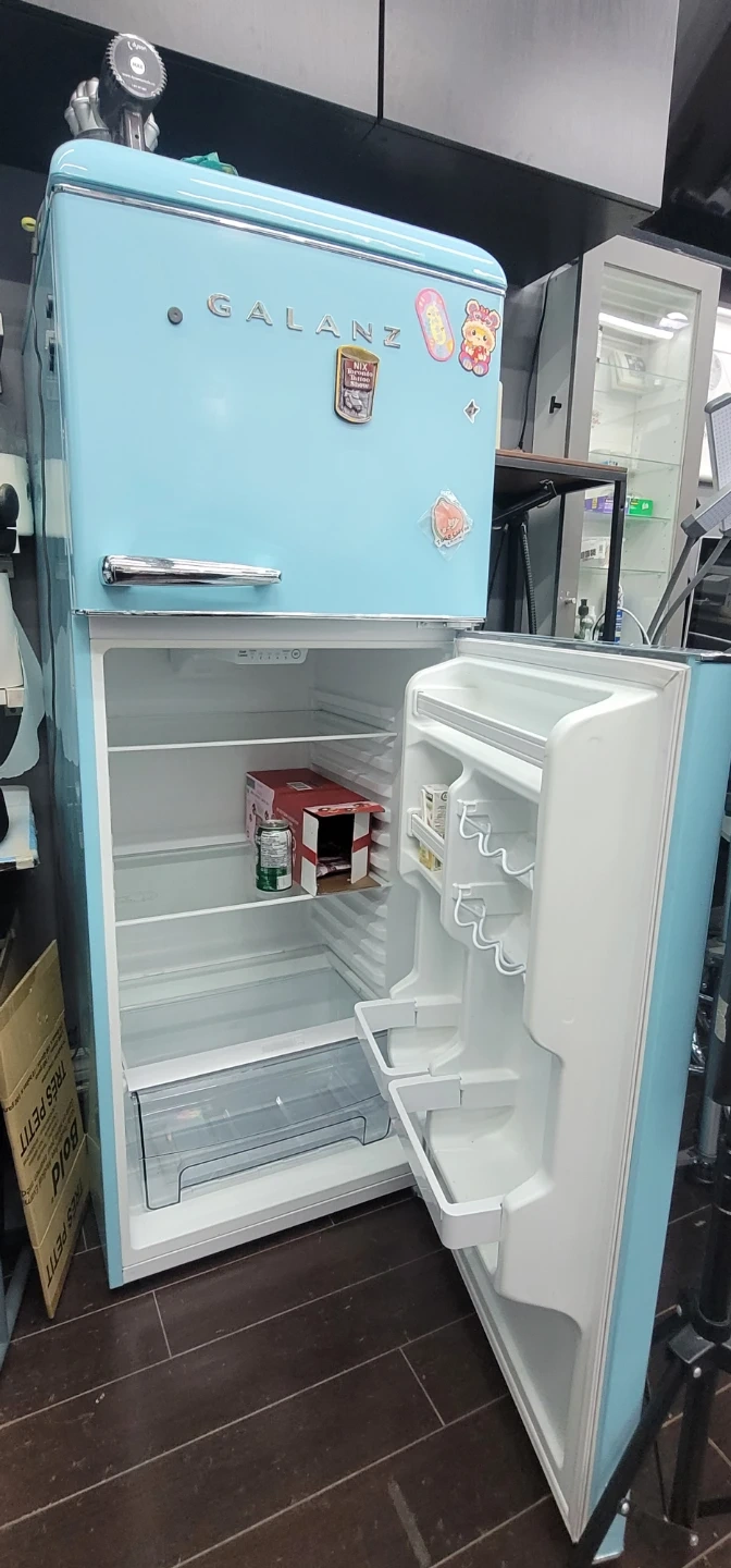 Selling a Galanz retro refrigerator in a lovely light blue colour. It's a real statement piece for any kitchen, adding a touch of vintage charm! It's in great condition..but..