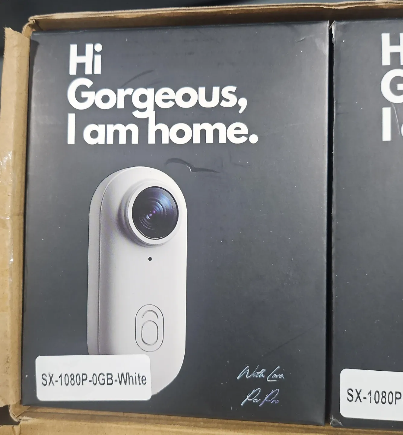 Selling a Papro SX-1080P-0GB camera in white! The box says, 'Hi Gorgeous, I am home.' It comes with the box