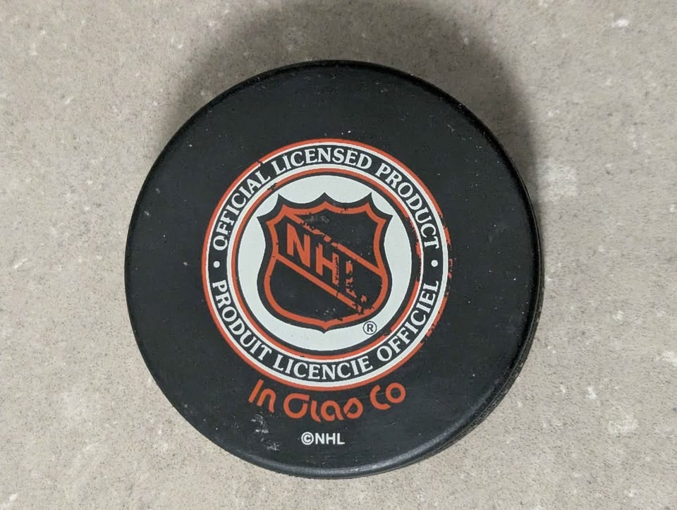 This is an official NHL puck, likely from the late 90s/early 2000s era.