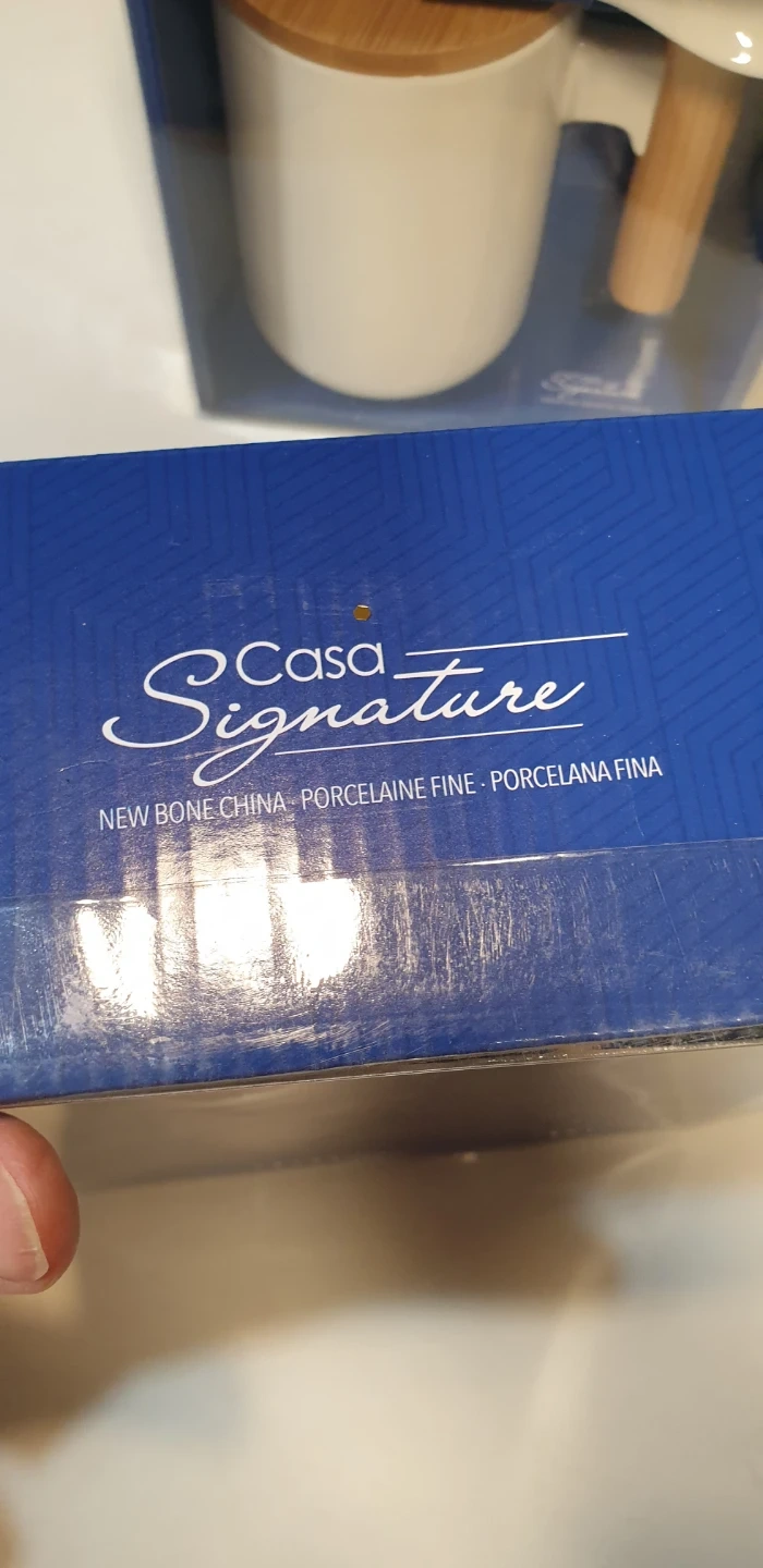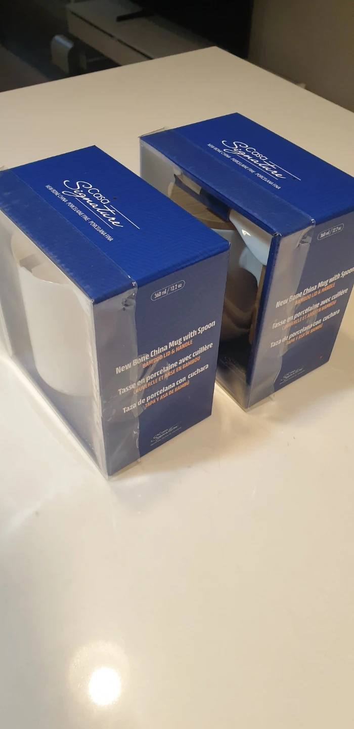Selling a new Casa Signature New Bone China mug with a spoon! It comes in the original box. The mug is white with a bamboo lid and handle. It's a stylish and practical addition to your kitchen or office