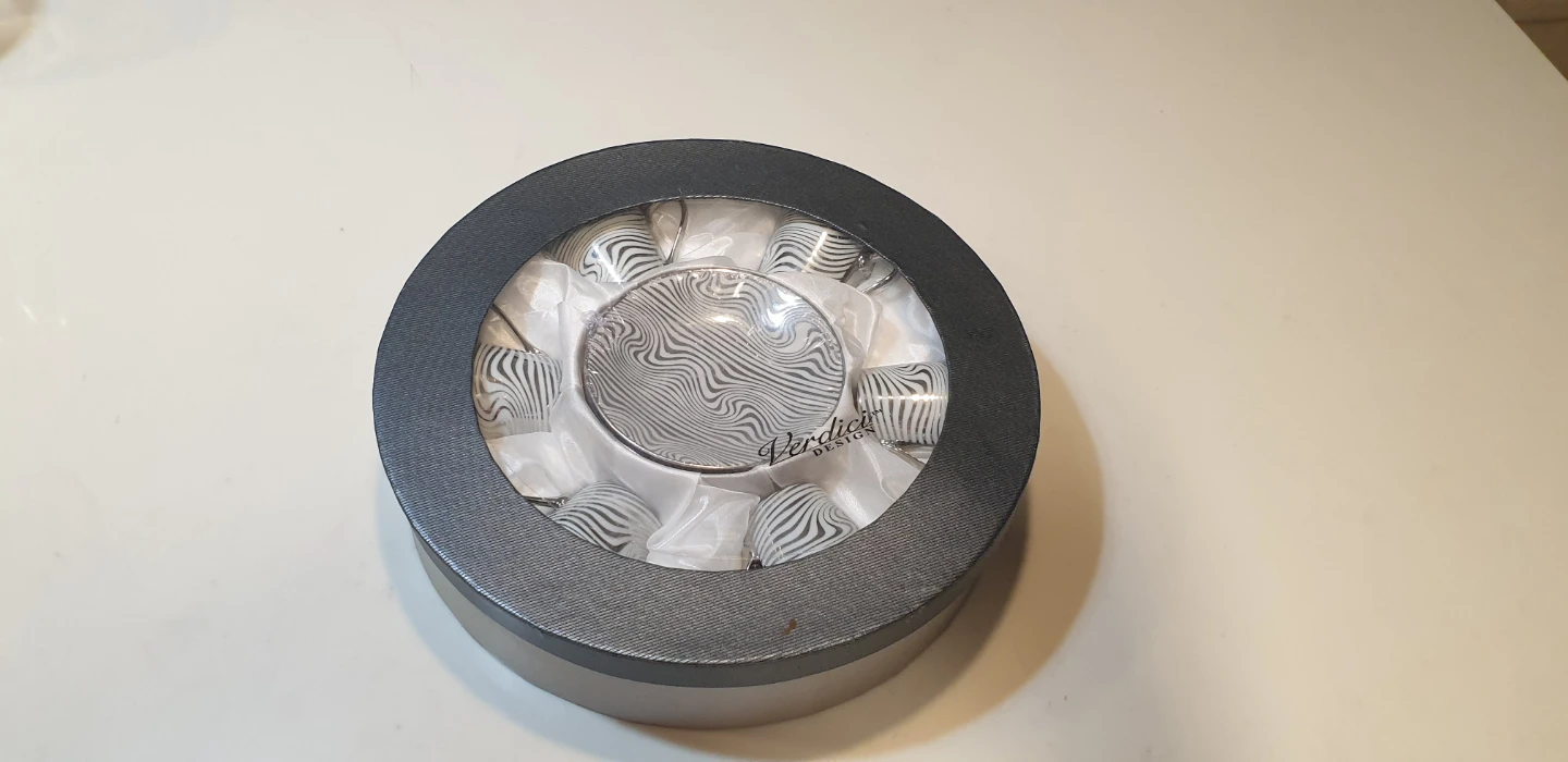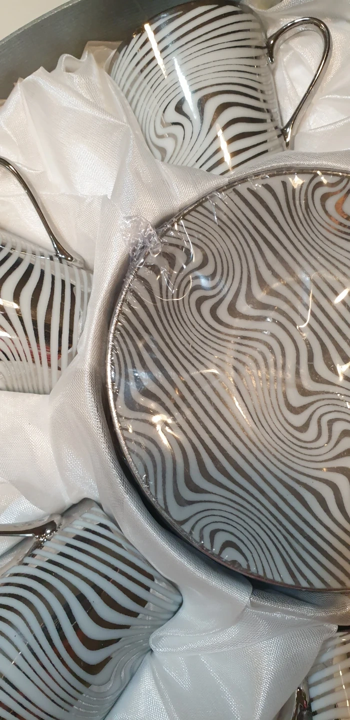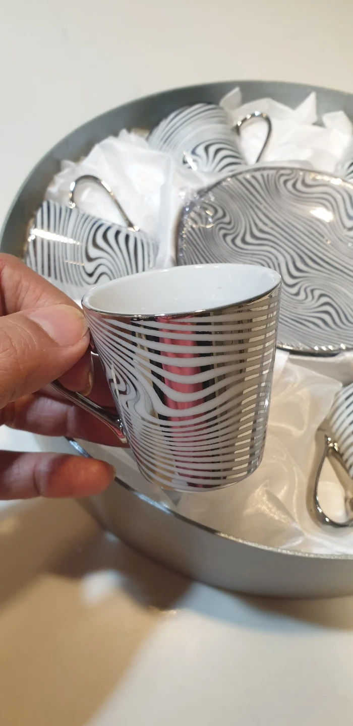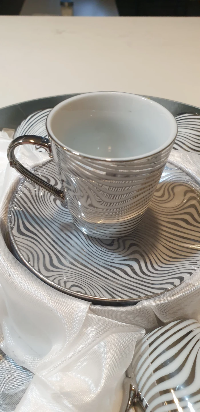 Selling a brand new espresso cup set from Perdicas Design! The set features a unique wavy design in silver and white. Perfect for adding a touch of elegance to your coffee routine. Comes in the original box.