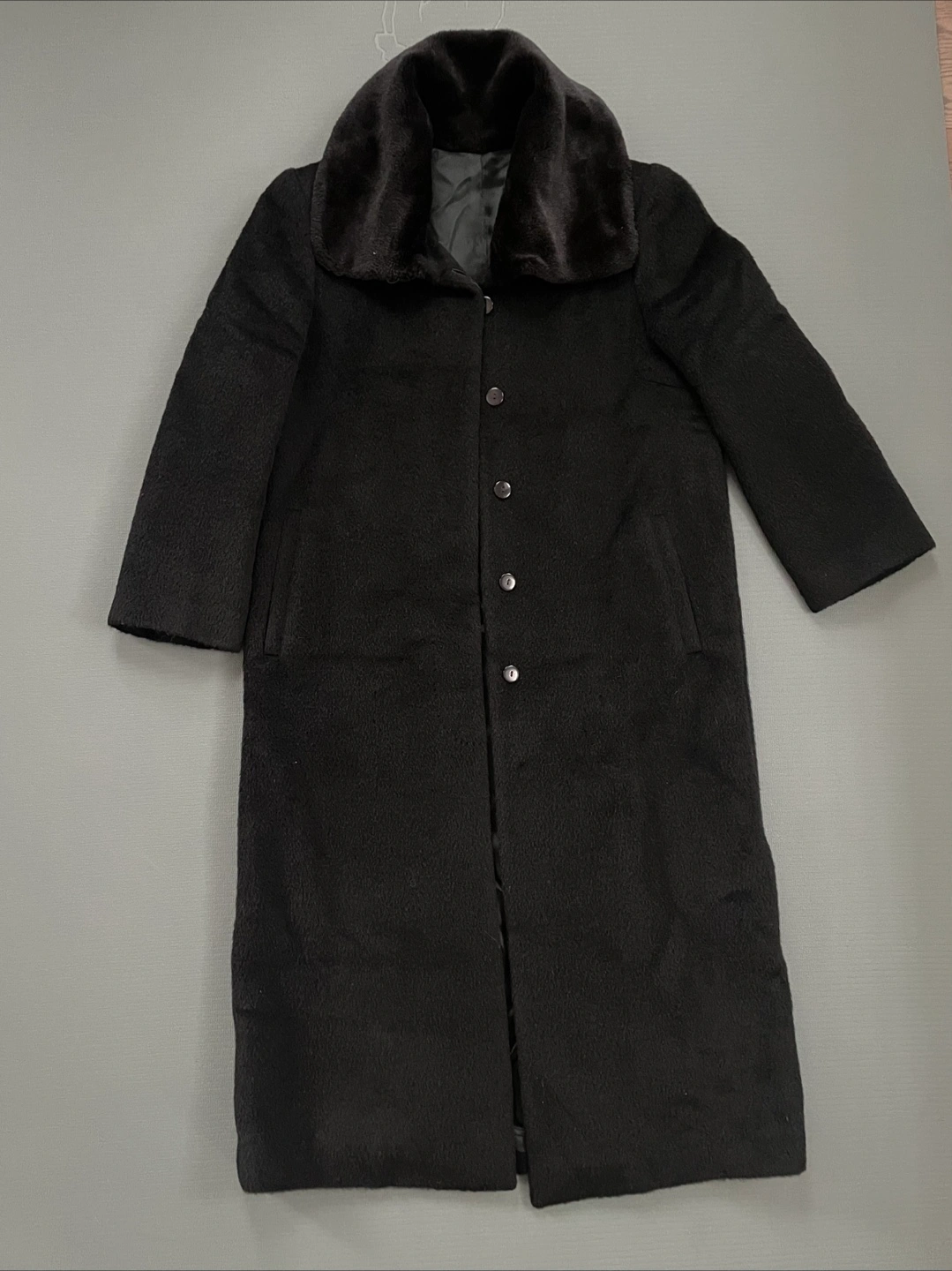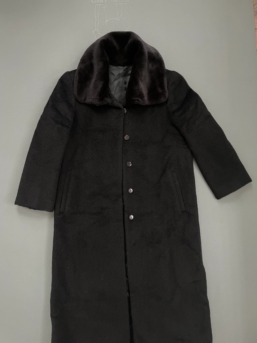 Selling a classic black long coat with a stylish fur collar! It's in great condition and perfect for keeping warm during the colder months. The coat measures approximately 16 inches across the shoulders and 50 inches in length.