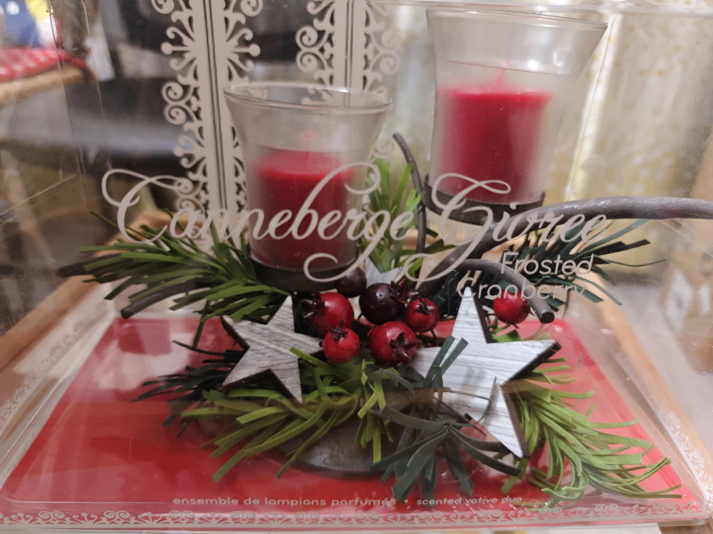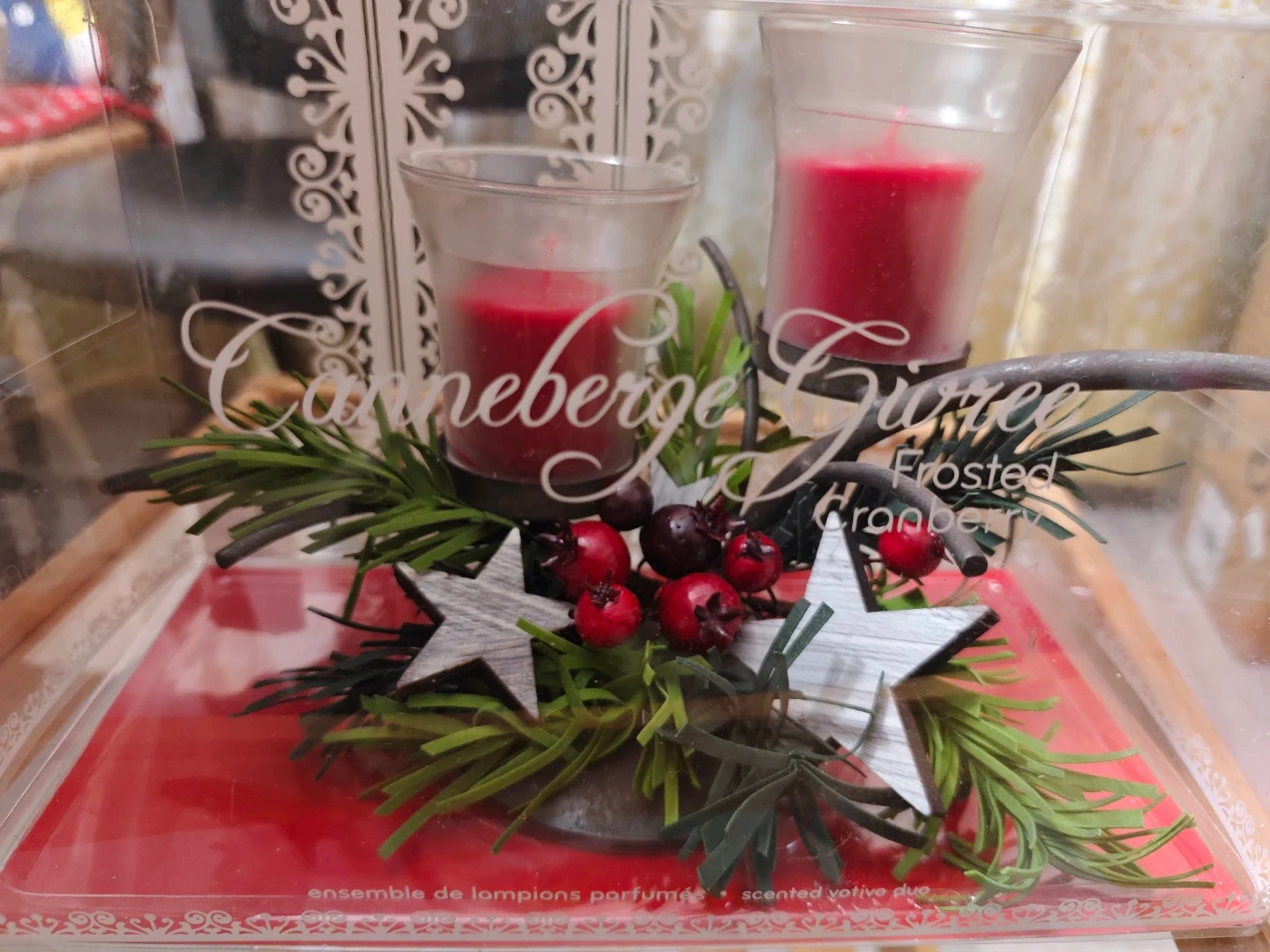 New condition. It features a frosted cranberry scent. It's a lovely decorative piece for any room!