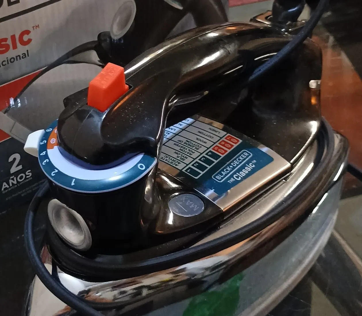 Selling a Black+Decker The Classic iron. It has a temperature setting dial with fabric type indicators. The iron also features a MAX fill line for water.