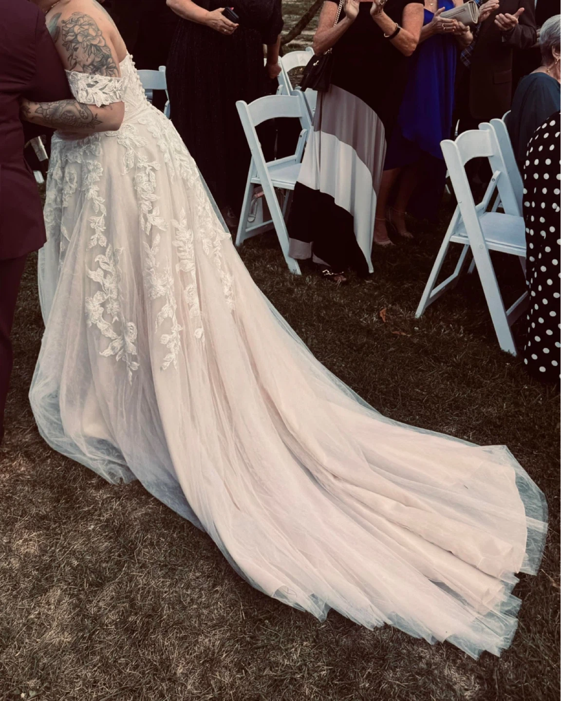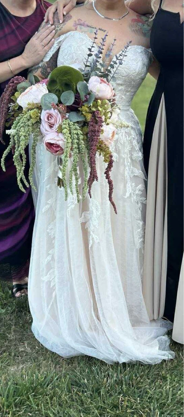 Selling a beautiful wedding dress with floral lace detailing. It's in great condition and ready for its next special day!