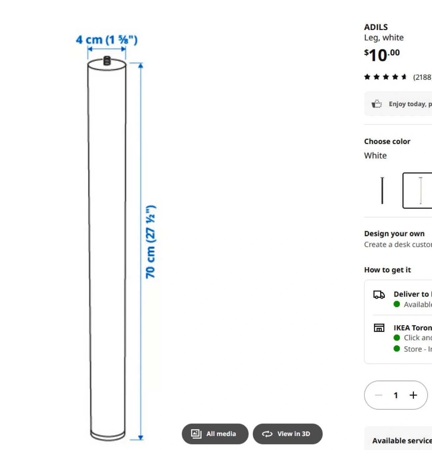 Selling a set of 4 IKEA legs in white. They measure about 27 inches in length and the diameter of the top is about 2 inches. These legs are perfect for creating a custom desk or table setup. Originally priced at $10 each.