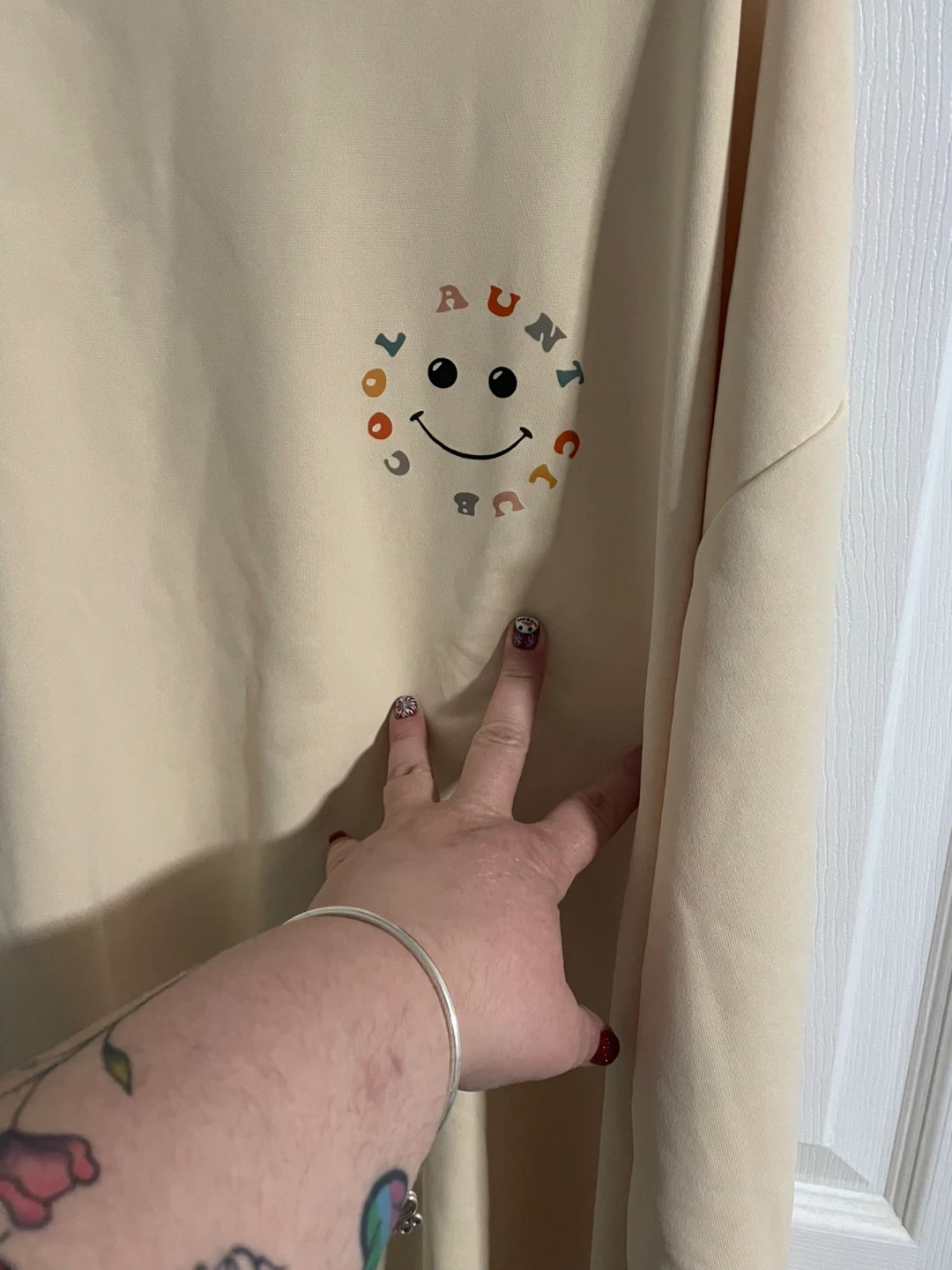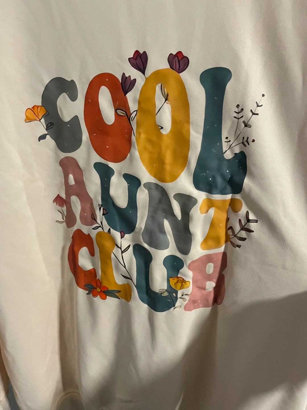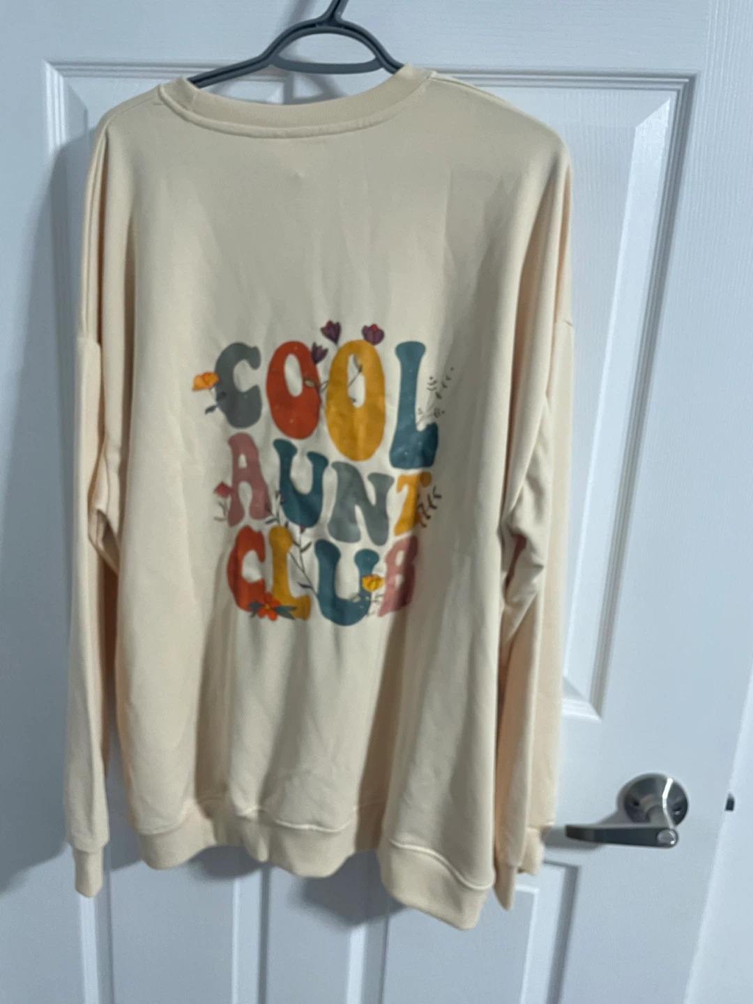 Selling a cute and comfy "Cool Aunt Club" sweater! It's a size 4XL and made of 100% polyester. The sweater is a light beige colour with colourful lettering and a smiley face design. Perfect for any cool aunt out there!