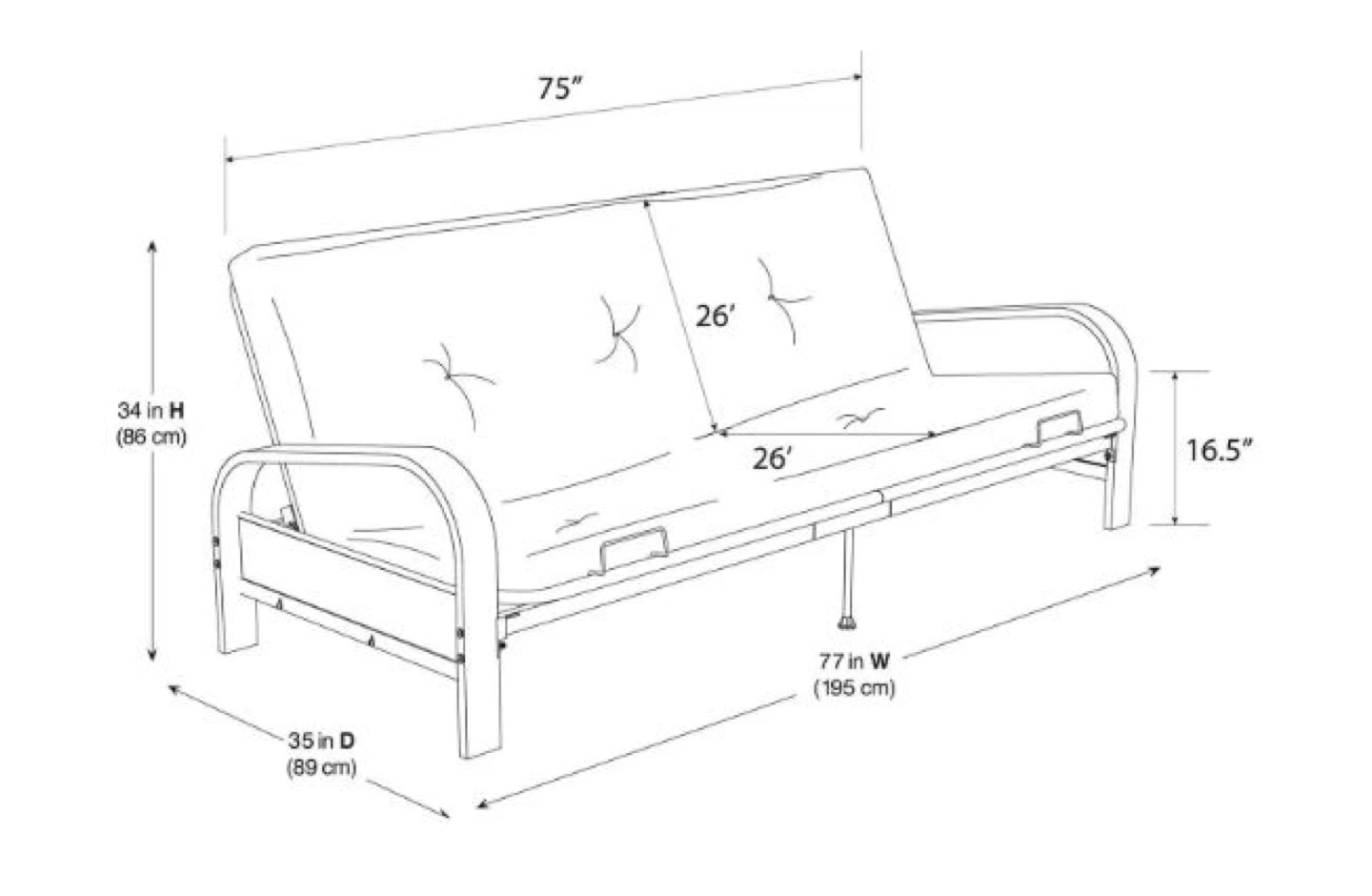 Approx. dimensions: 77” L × 35” W × 34” H