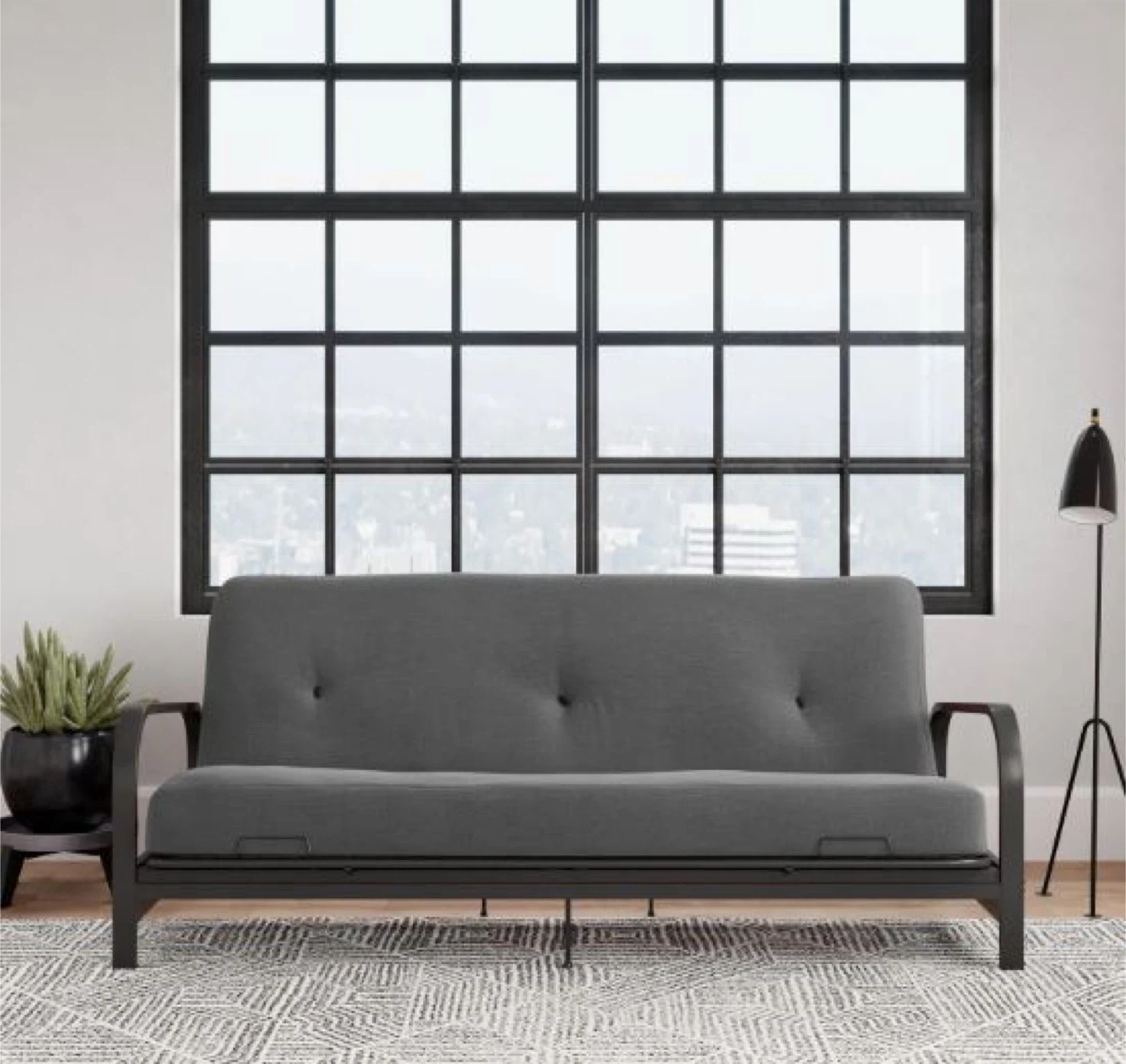 1️⃣ Cleo Black Metal Arm Full-Size Futon + 6” High-Density Mattress