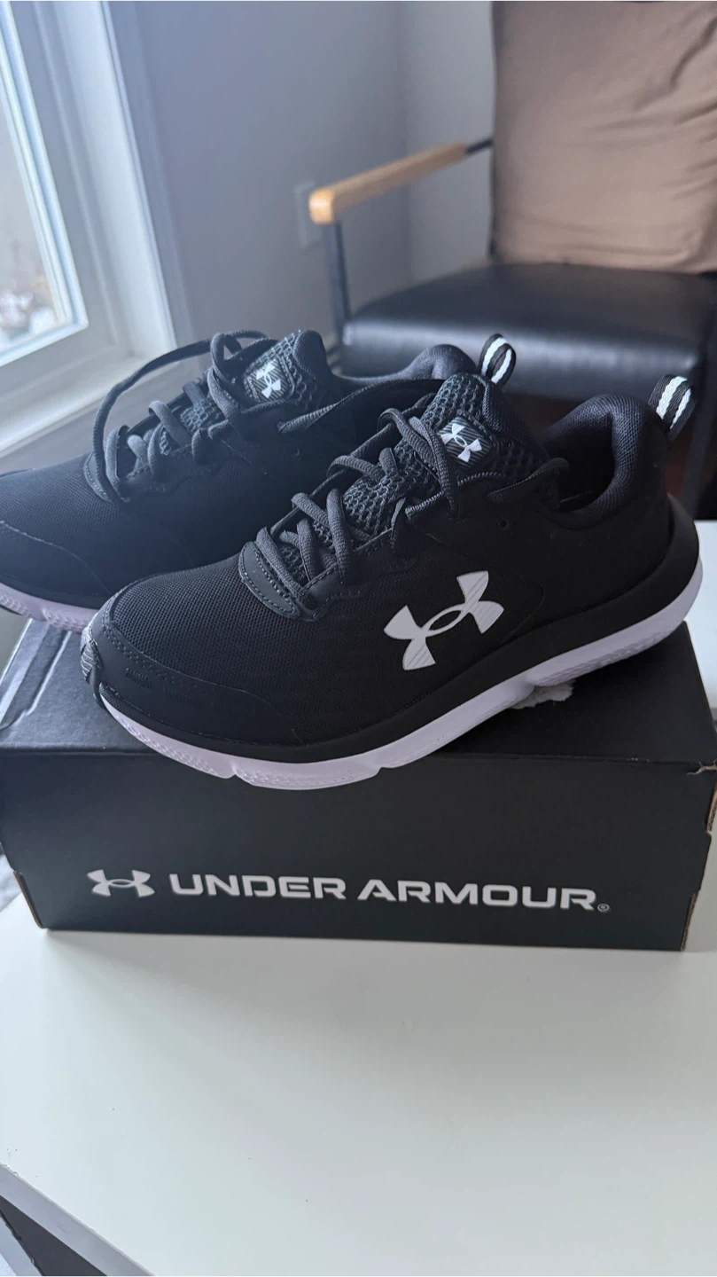Selling a pair of women's Under Armour Charged Assert 10 D running shoes in size 6. They come in black and are in great condition. The box is included!