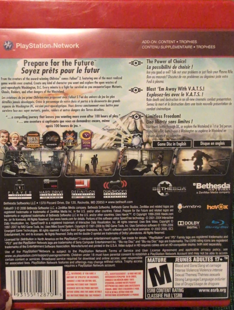Selling a used copy of Fallout 3 for the PlayStation 3! It's the Greatest Hits edition and comes in the original red case with the game disc and Vault Dweller's Survival Guide. The game is rated M for Mature. A compelling journey that lets you control a lone wanderer in the post-apocalyptic wastelands of Washington, D.C.