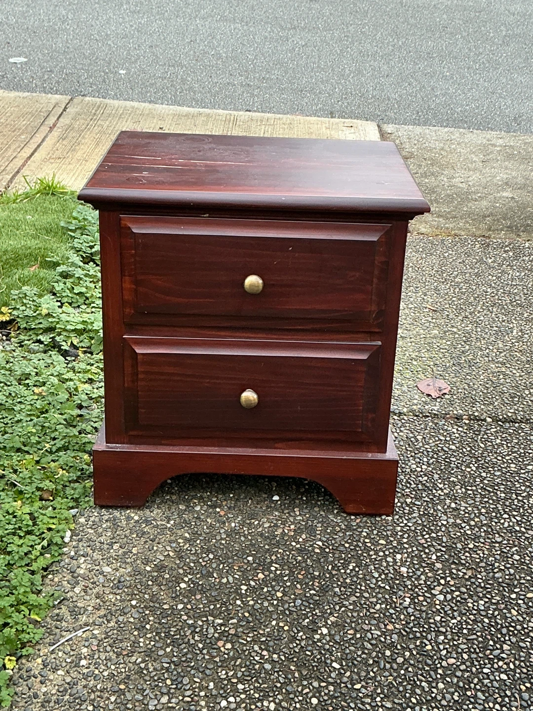 Here's a wooden nightstand with two drawers! It's a lovely piece for any bedroom. It has a nice dark red finish with some wear and tear on the top surface. Address given only upon confirmed appointment. You pick up.