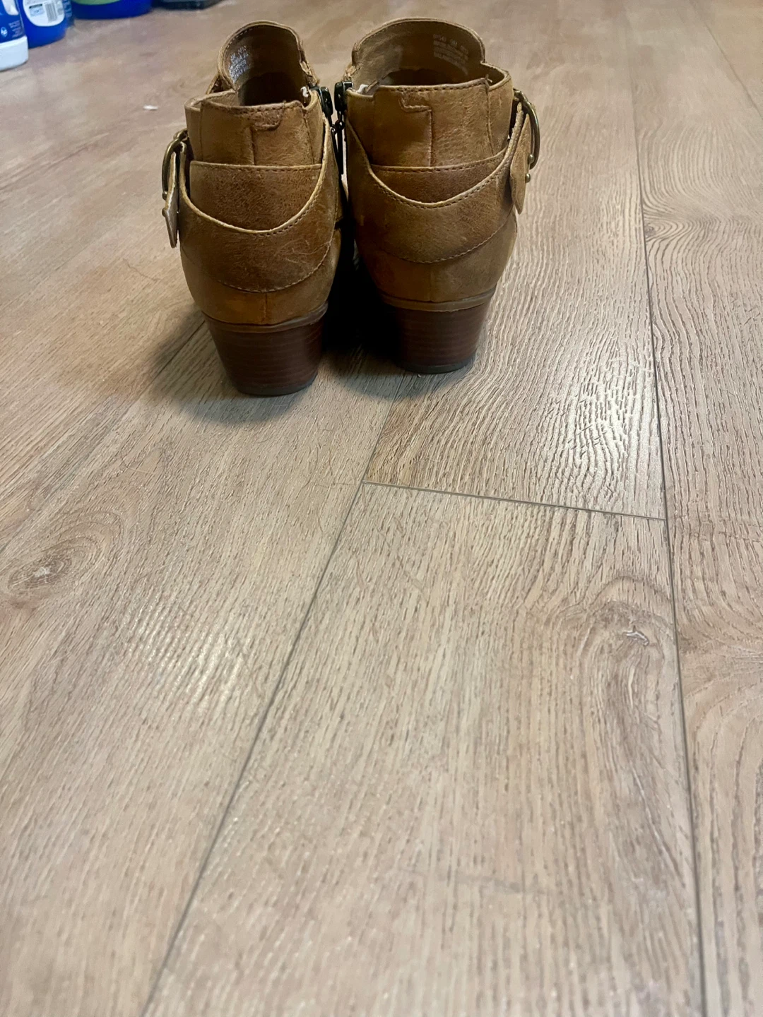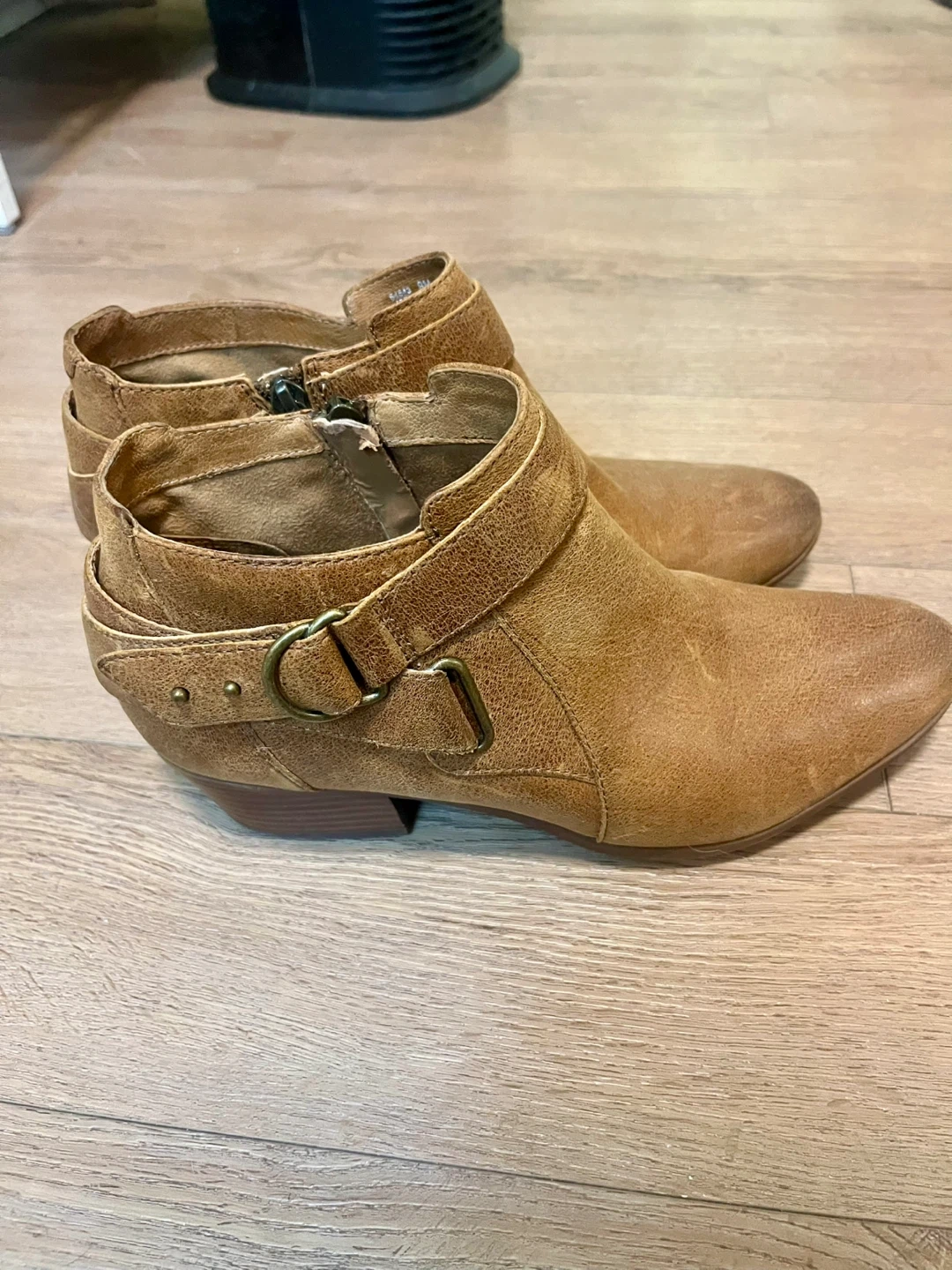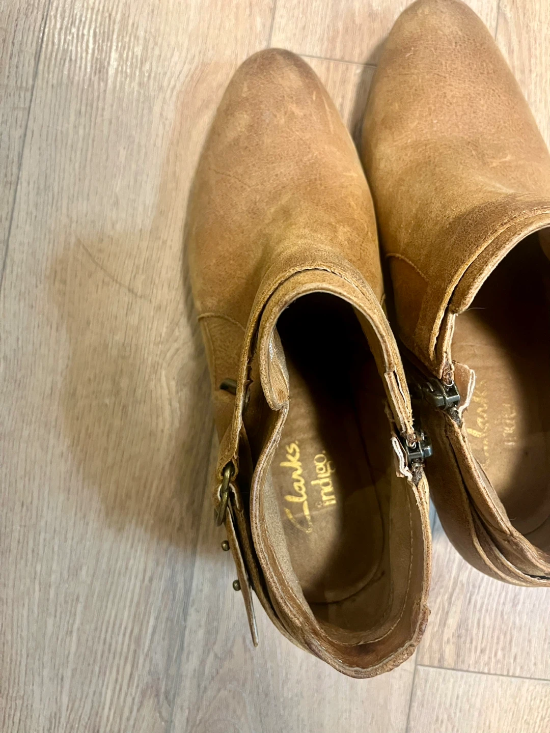 Selling a pair of Clarks Indigo ankle boots in a lovely brown leather. They are a size 9M and have a stylish buckle detail. These boots have some signs of wear, as shown in the pictures, but still have lots of life left!