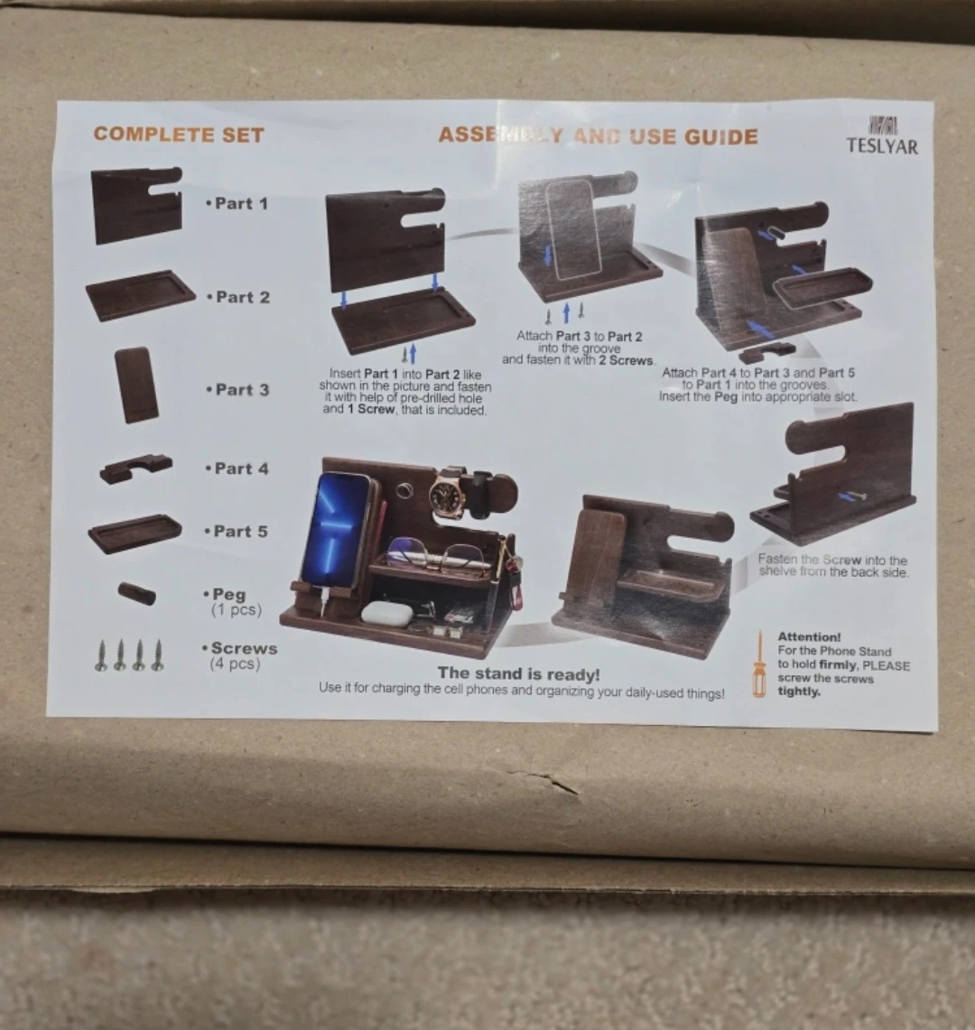 Selling a brand new TESLYAR wood phone docking station! It's a complete set with all parts and screws included. The stand is ready for charging cell phones and organizing daily items. A unique design and smart solution to keep your things organized!