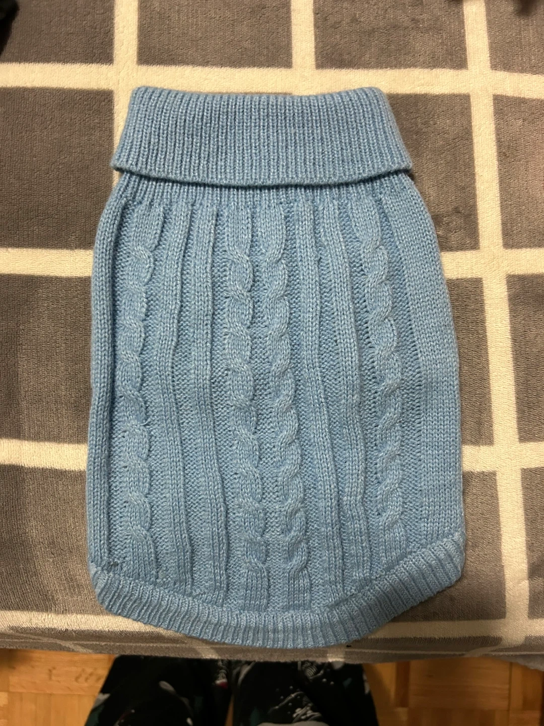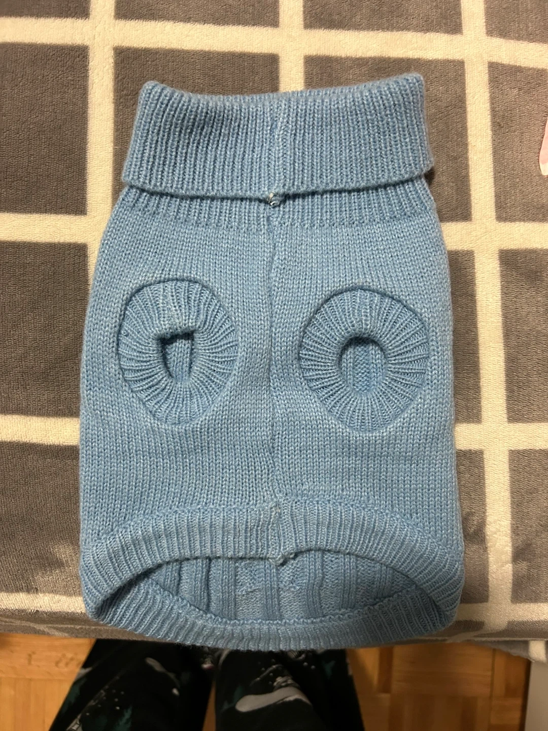 Here's a cozy homemade blue knit sweater for your furry friend! It's in great condition.