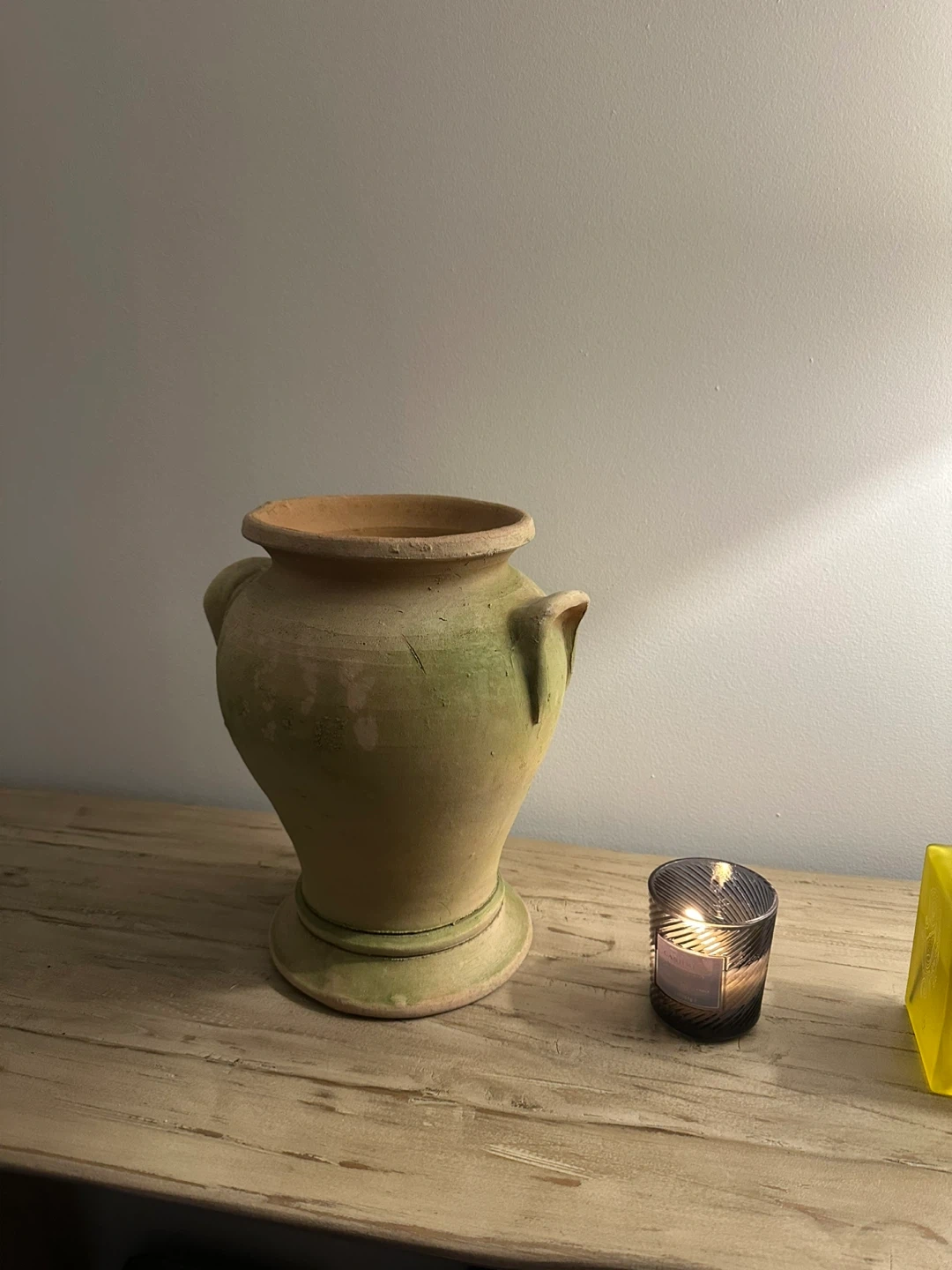 Selling a charming rustic terracotta vase with a beautiful green hue. It's a unique piece that would add character to any room. The vase has a lovely, weathered look, perfect for a vintage or farmhouse style.
