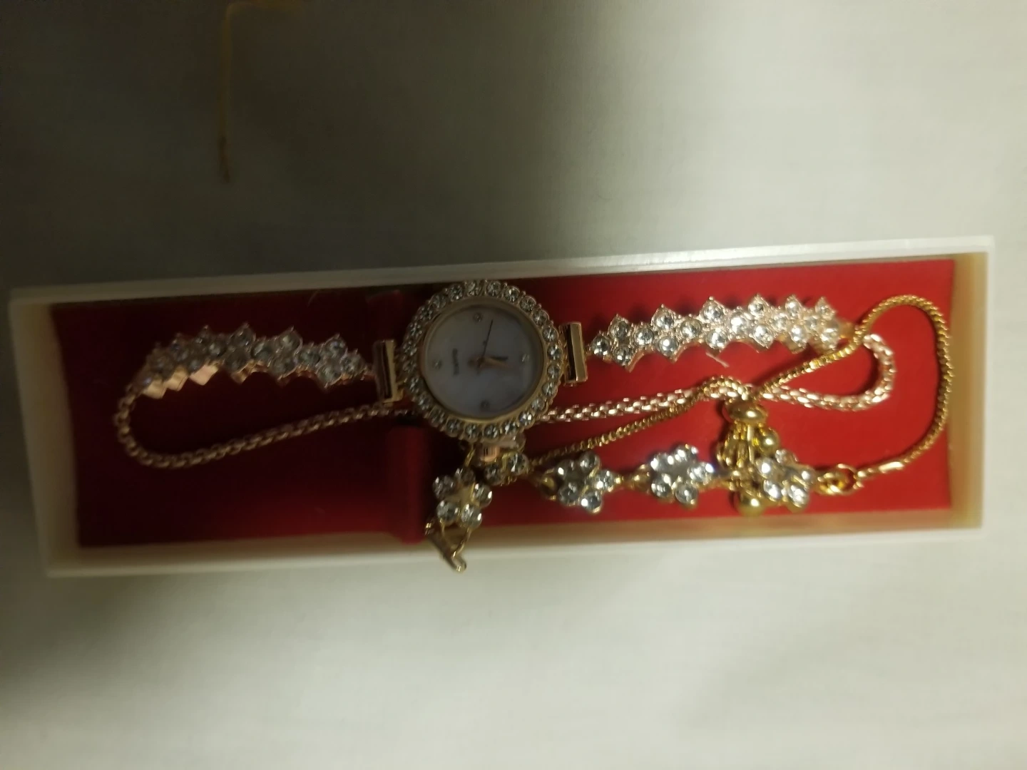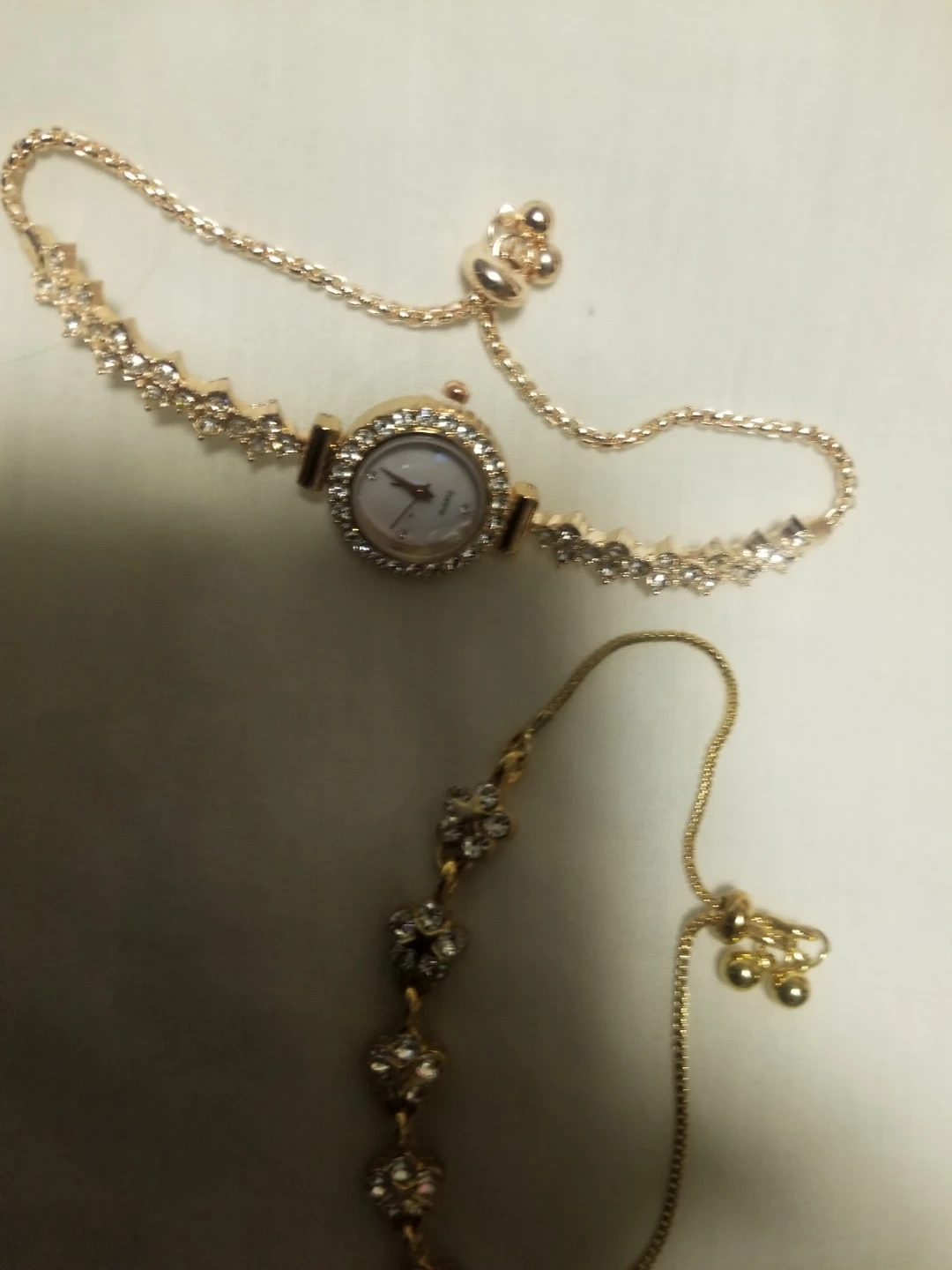 Selling a lovely ladies' watch and bracelet set! The watch features a delicate gold-tone finish with sparkling accents. It comes with matching bracelets to complete the look. Perfect for adding a touch of elegance to any outfit