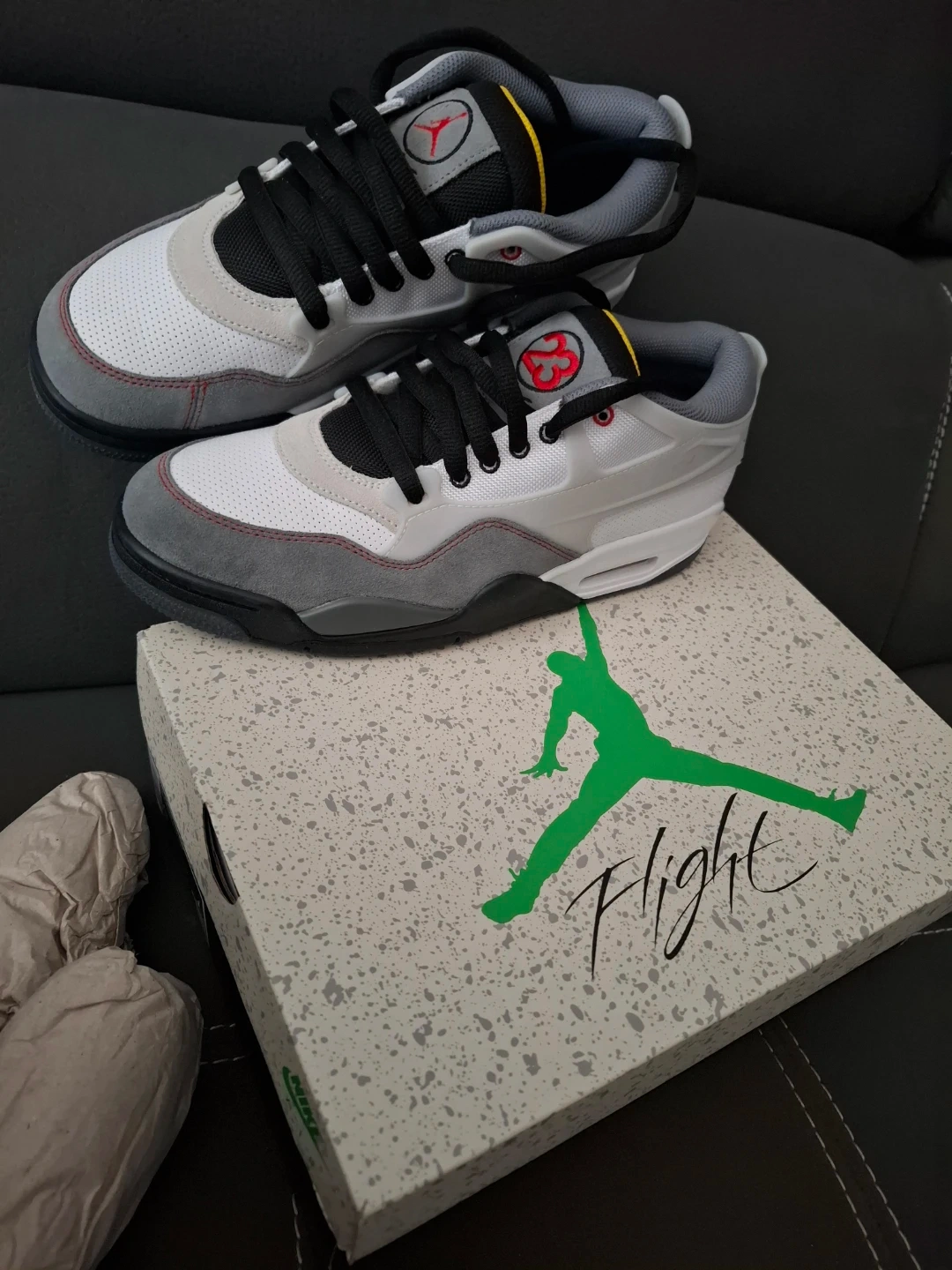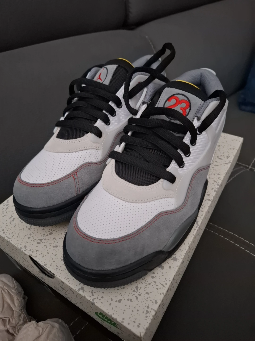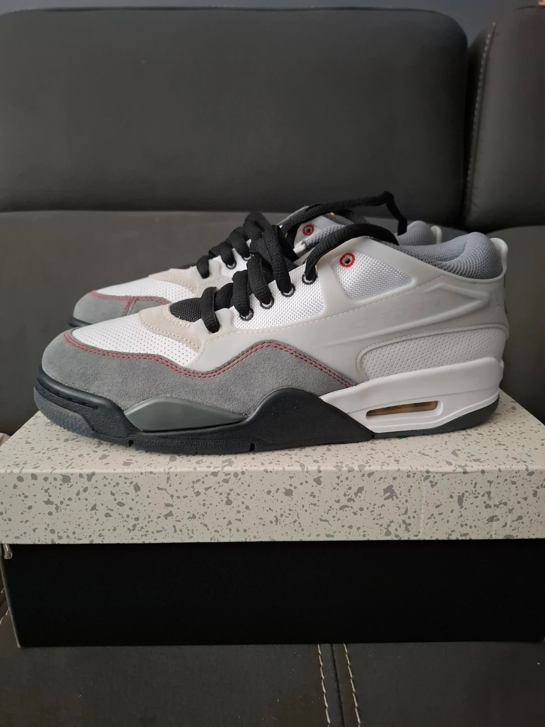Selling a pair of Air Jordan 4 RM PRM sneakers in size 9! They come in a white, fire red, and black colourway. The box is included! Brand New!