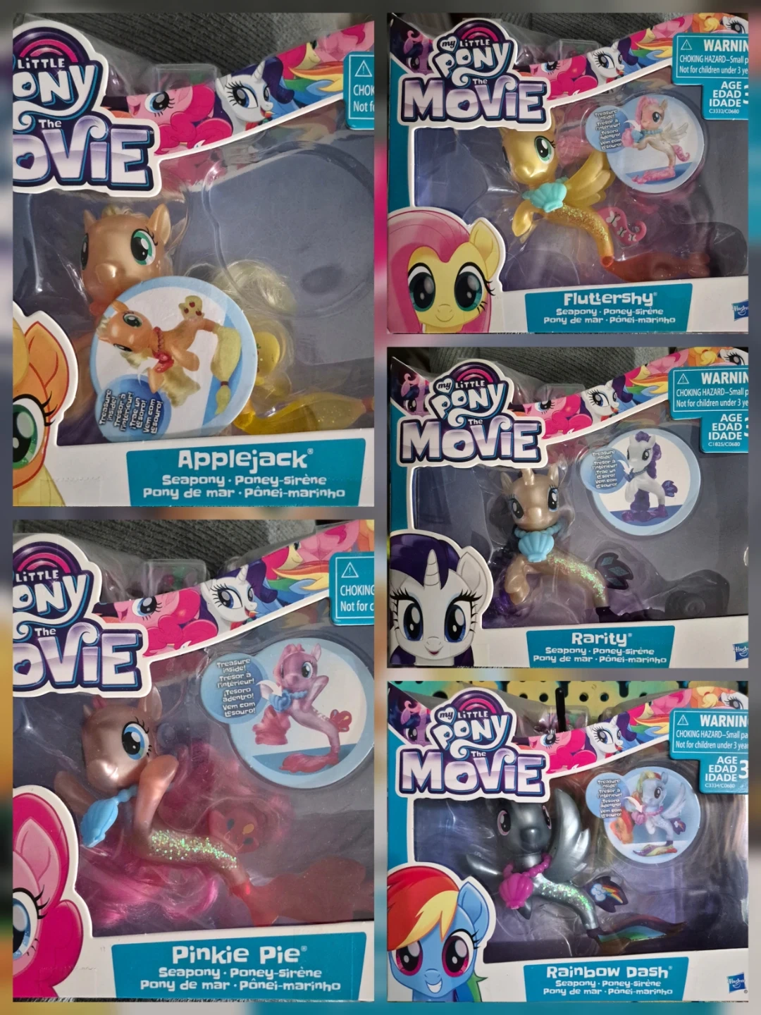 Selling a set of My Little Pony: The Movie Seapony figures! The set includes Applejack, Fluttershy, Rarity, Pinkie Pie, and Rainbow Dash, all new in their original packaging. Perfect for collectors or kids who love My Little Pony