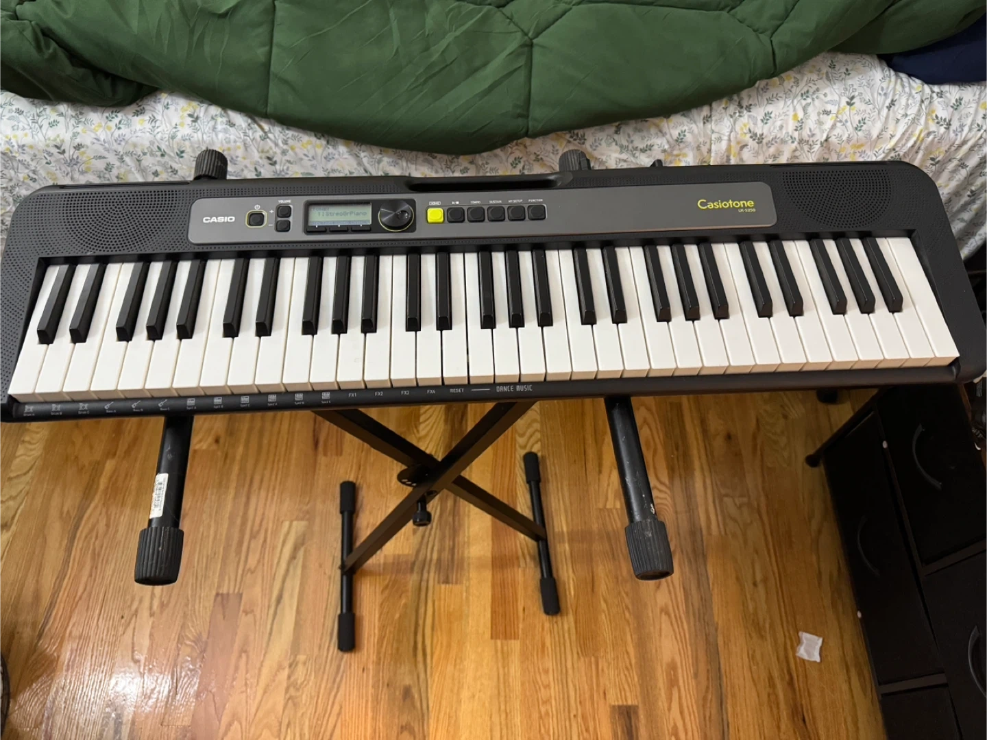 This is Leonardo DeCasio. It is a Casio LK-S250 keyboard! It's in great shape and ready for a new musician. Perfect for learning and having fun. Connects to Chordana Play for IOS/ Android. Power Cable and stand included and if you ever miss the cable, the keyboard does take batteries.