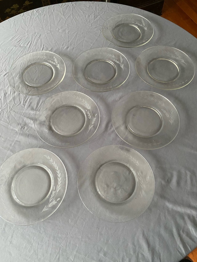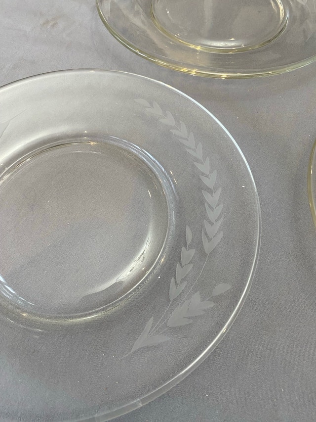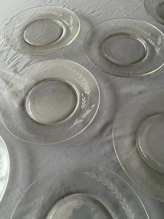 This set of 8 vintage glass dessert plates features a delicate wheat design etched around the rim, adding a touch of elegance to any table setting; the plates are in excellent condition. These plates bring a touch of elegance to any dessert course, and they're just waiting to be part of your next dinner party!