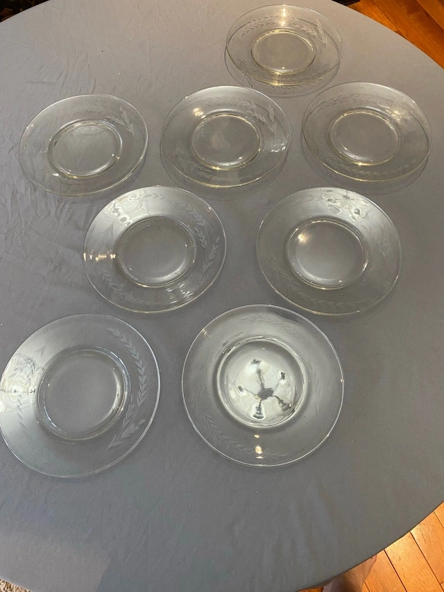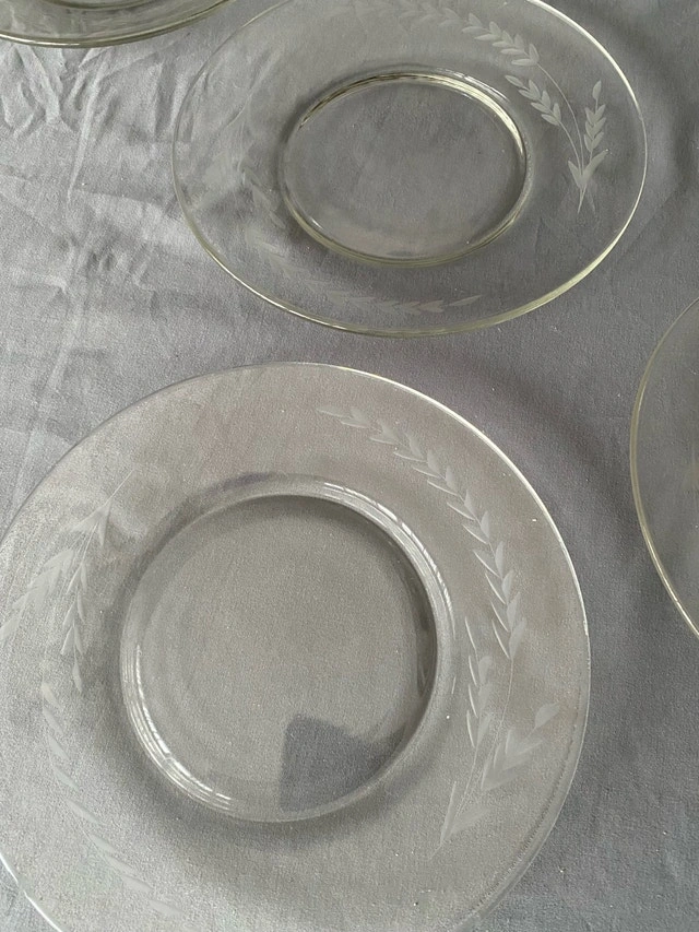 This set of 8 vintage glass dessert plates features a delicate wheat design etched around the rim, adding a touch of elegance to any table setting; the plates are in excellent condition. These plates bring a touch of elegance to any dessert course, and they're just waiting to be part of your next dinner party!