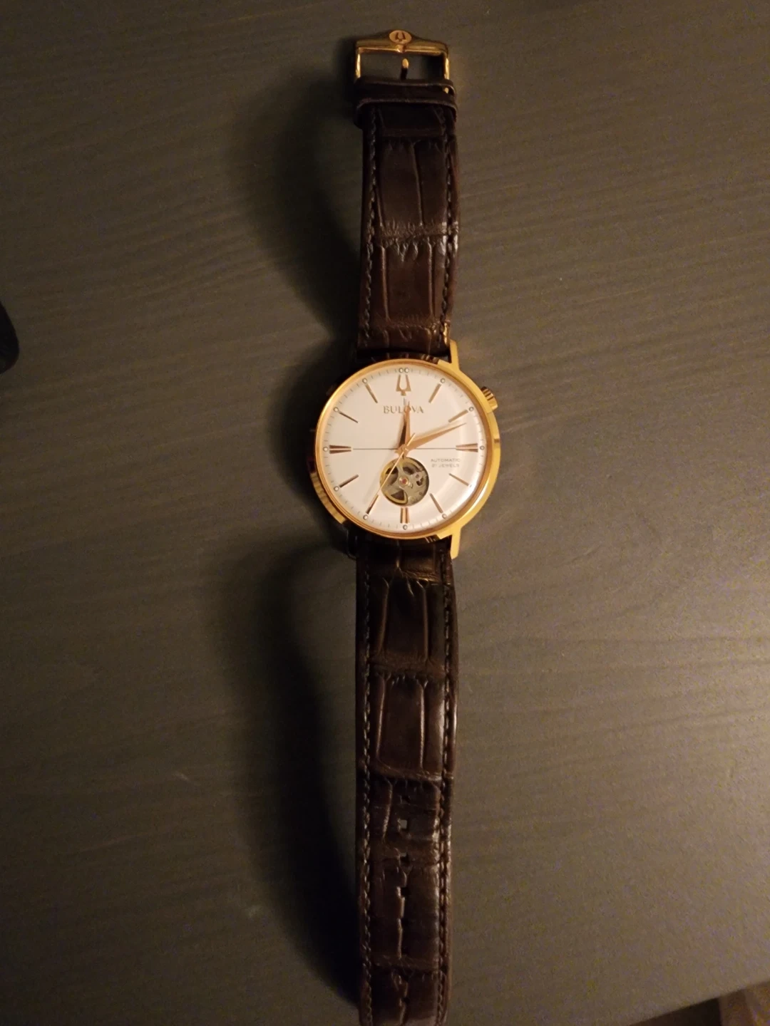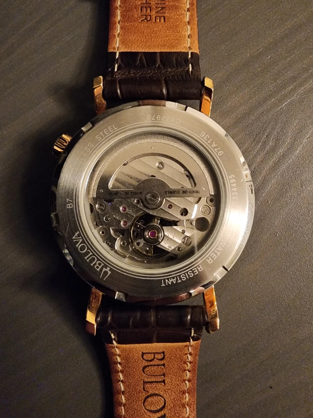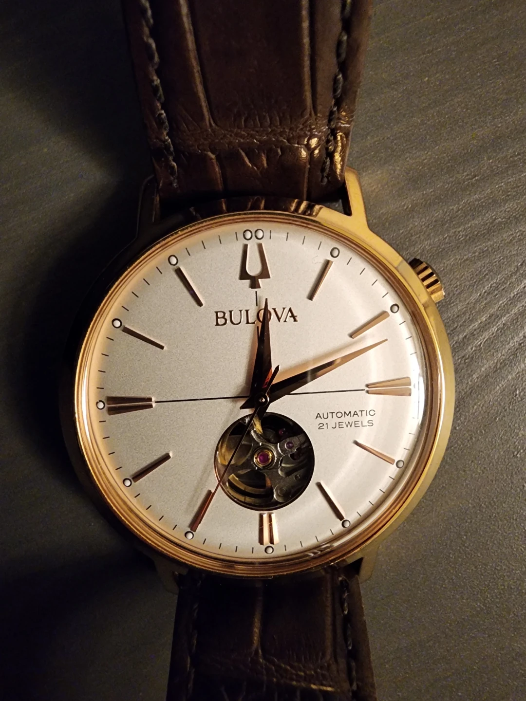 Selling a Bulova Aerojet automatic watch. With 21 jewels. It features a brown leather strap and a rose gold-tone case. The watch is water resistant and has a stainless steel case. It's in great shape and ready for a new wrist!