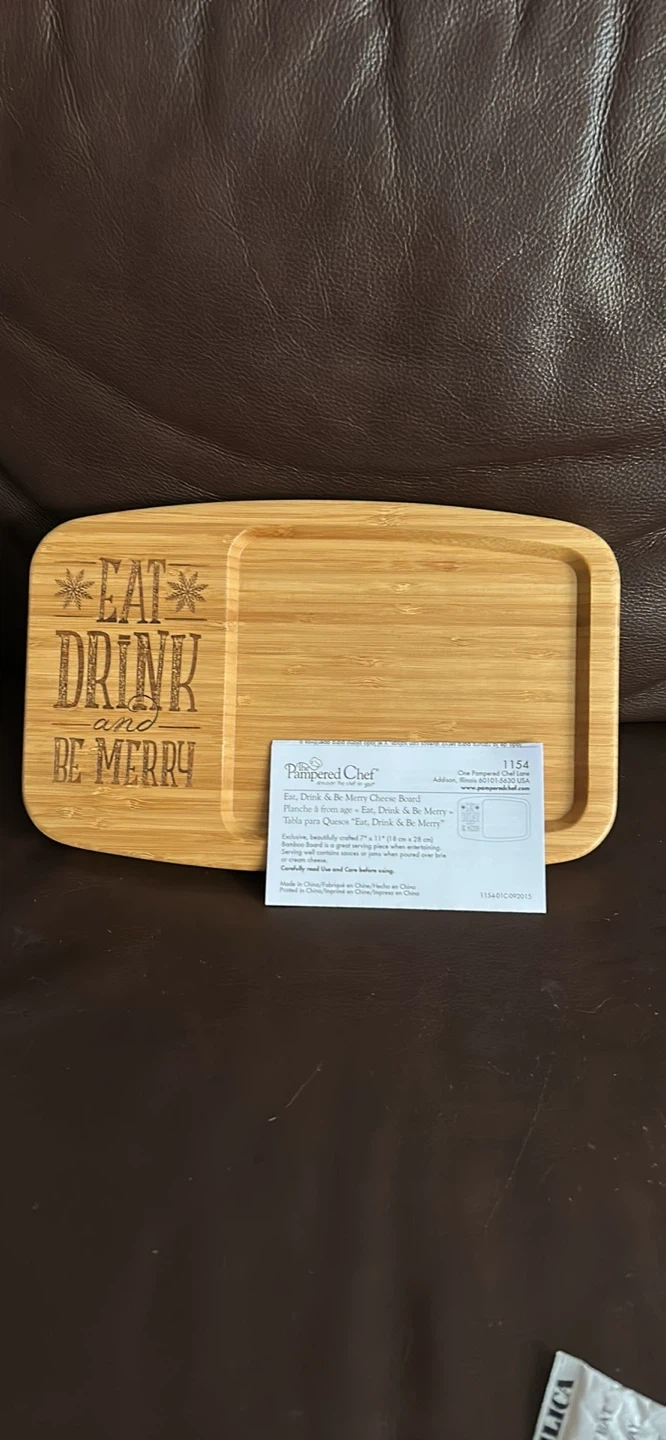 1. Eat, Drink & Be Merry Cheese Board. Words engraved on board.