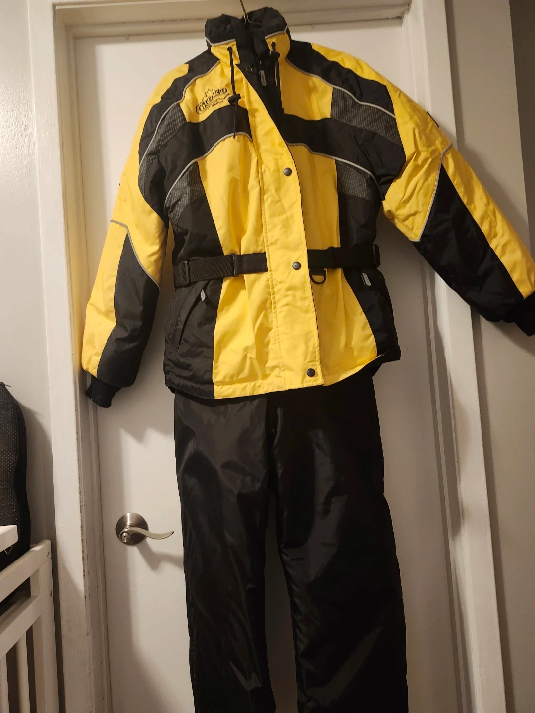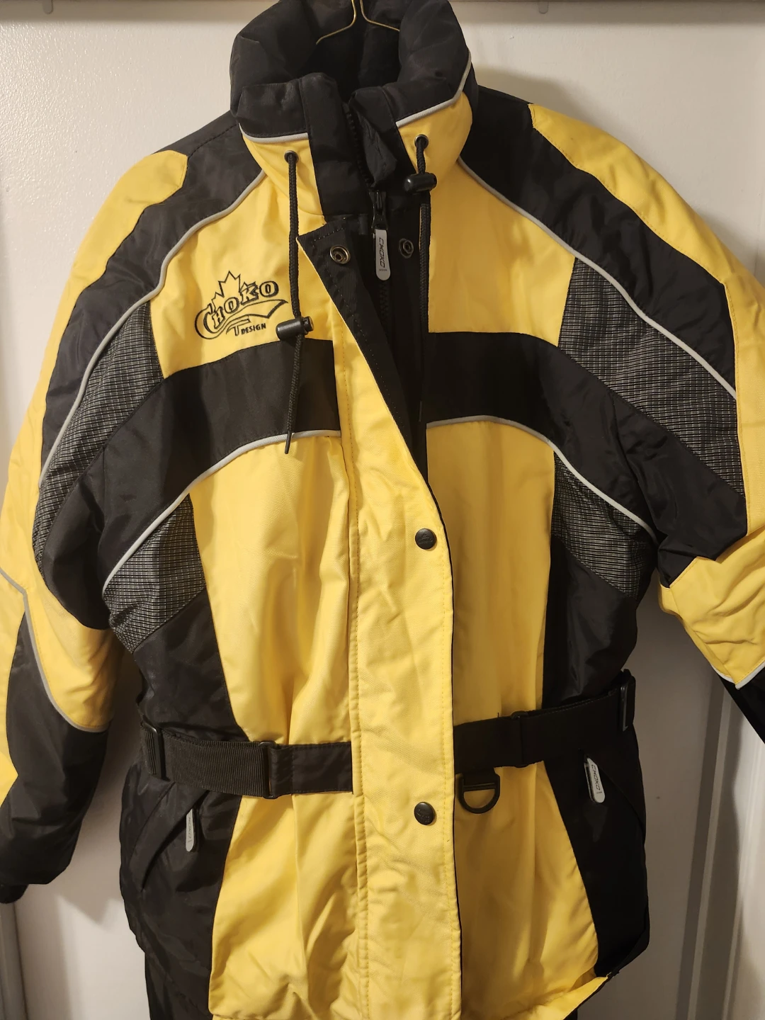 Selling a Choko Design Trail Star snowmobile suit in size M. It's a stylish yellow and black colour combo! This suit is perfect for staying warm and dry on the trails this winter season. It has a built-in belt for a snug fit and is in great condition