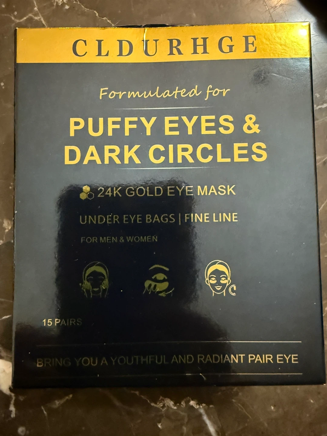 I'm selling a box of CLDURHGE 24K Gold Eye Masks. This set is formulated for puffy eyes and dark circles. It helps with under-eye bags and fine lines, and it's suitable for both men and women. The box contains 15 pairs to bring you a youthful and radiant pair eye!